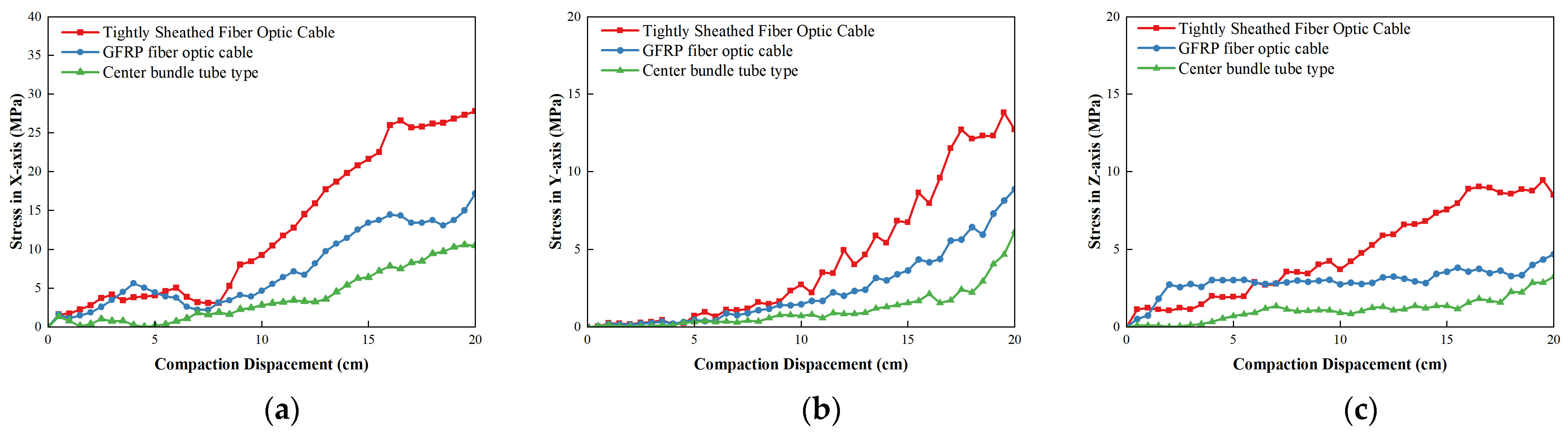 Y-direction was greater than the maximum allowable compressive stress 6.4 MPa, which exceeds the critical state. It indicated that the optical cable without strengthening elements of the tight sheath cannot withstand the repeated impact load during the vibration rolling of the road base which needs to be strengthened in the form of the optical cable structure. It could be attributed to the limited axial stiffness and radial load bearing capacity of the tight-buffered optical cable. Under the external loads, forces could be more directly transmitted to the core area of the cable. Consequently, the direct transmission was more likely to induce stress concentrations and irreversible signal attenuation.