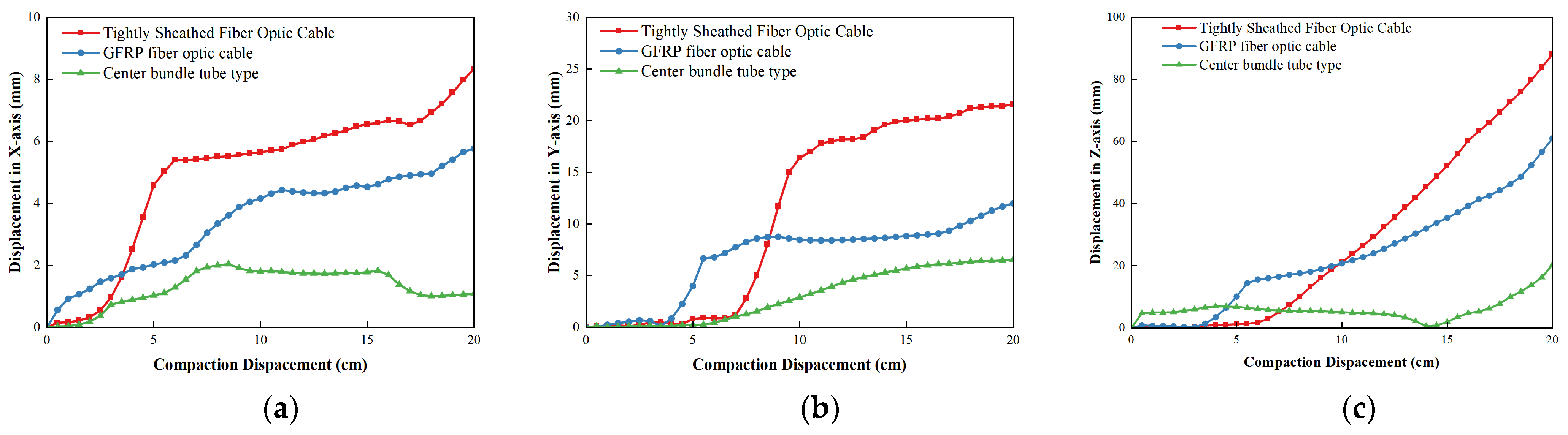 Figure 11 shows the displacement change in the tight-buffered unreinforced element cable, GFRP reinforced element cable and central bundle tube armored cable. During the compaction process increase the compaction depth, the displacement in the