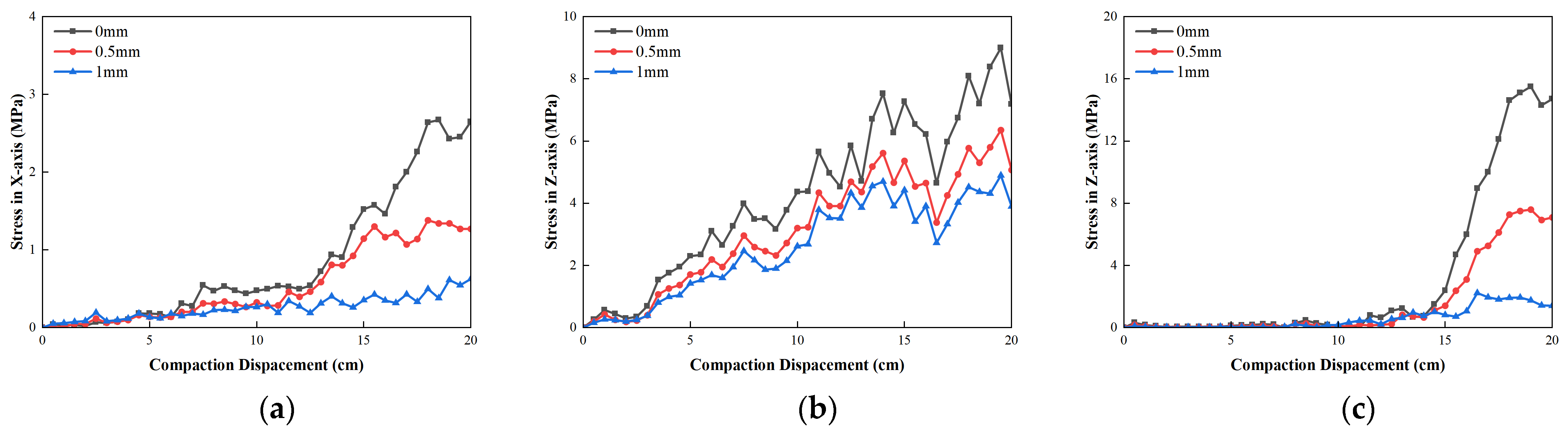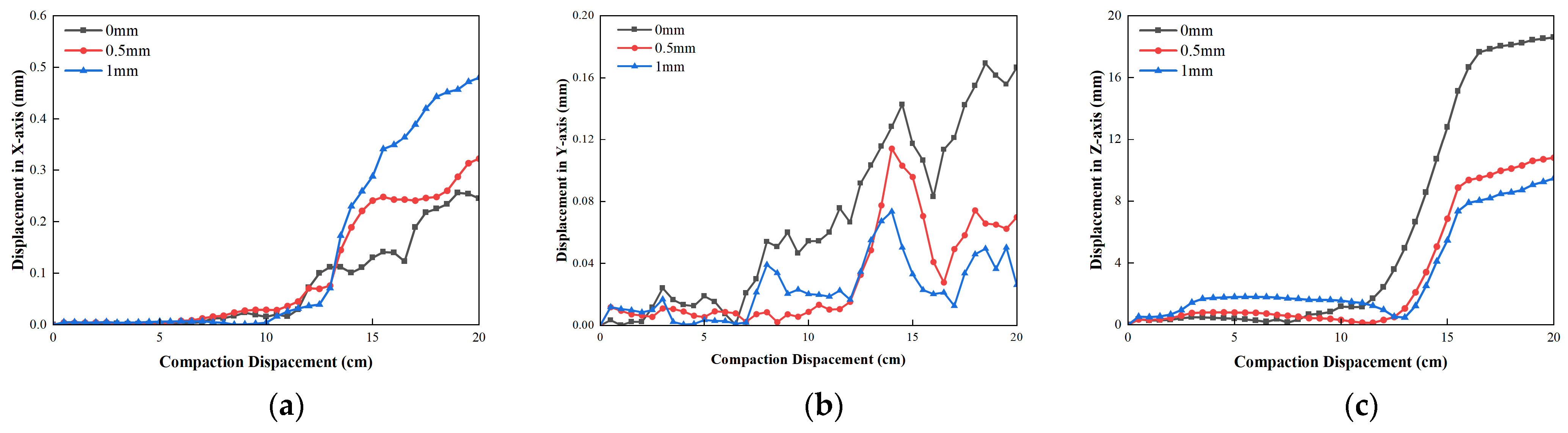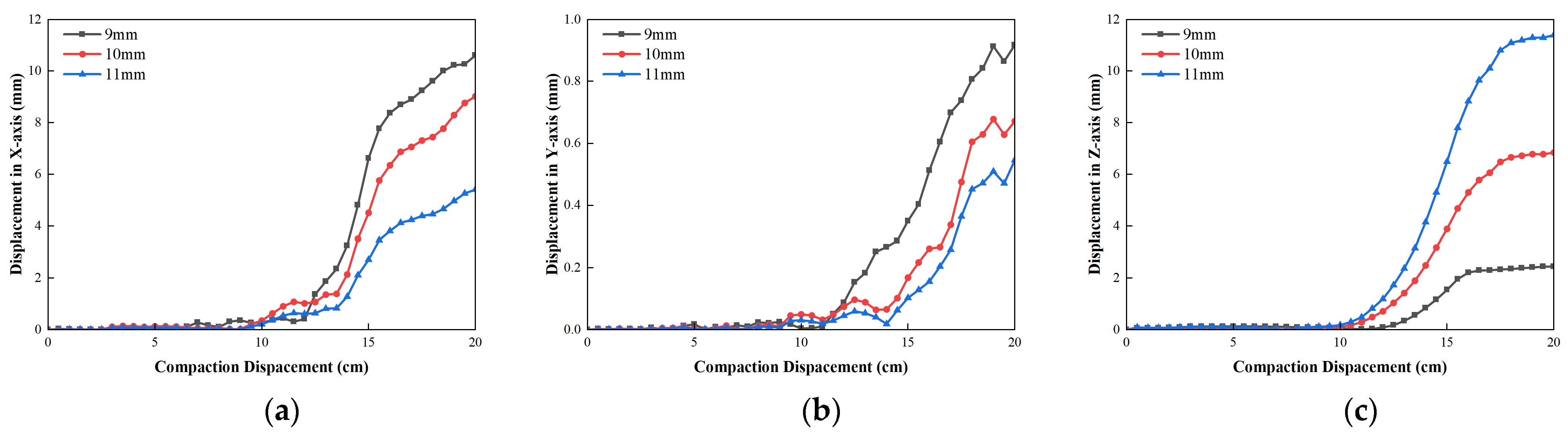 Figure 15, as the increase in the armored layer thickness, a change in the triaxial displacement of the optical cable is reduced. As the increase in armored thickness, the Z displacement is greatest and the maximum Z displacement is reduced from 2.45 mm to 11.4 mm, while the maximum X displacement is reduced from 10.61 mm to 5.41 mm and the maximum Y displacement is reduced from 0.92 mm to 0.55 mm. It shows that increasing the thickness of the armored layer can effectively reduce the radial and axial line position error of the optical cable under the compaction process. The increase in the thickness of the armor layer enhanced the impact resistance of the optical cable and its ability to coordinate deformation with the surrounding particulate medium.