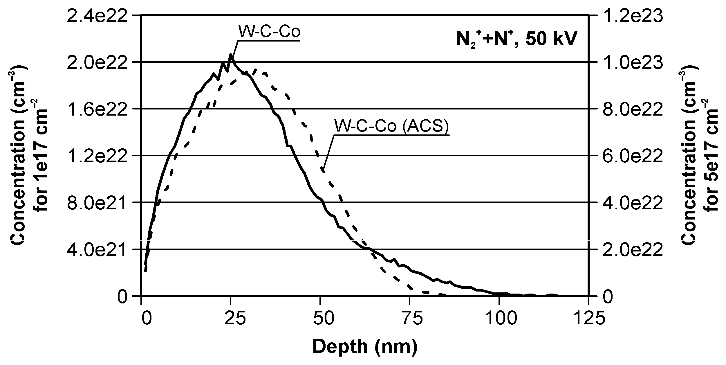 - WC–Co tools implanted with N ions at 50 kV using fluences of 1 × 1017 and 5 × 1017 ions·cm−2