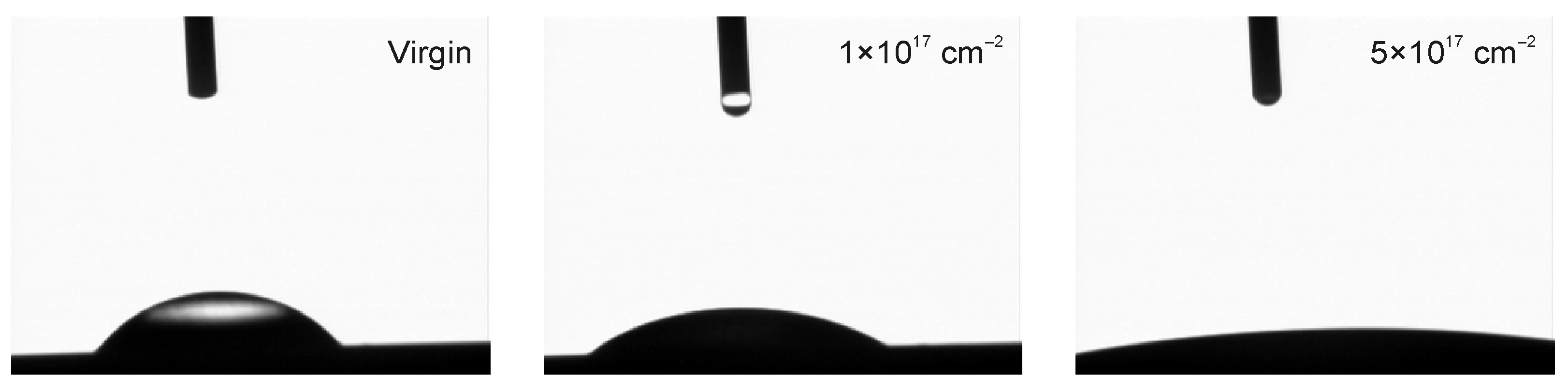 - Wan, G.J.; Fu, R.K.Y.; Yang, P.; Ho, J.P.Y.; Xie, X.; Huang, N.; Chu, P.K. Surface Wettabiliy of Nitrogen Plasma-Implanted Silicon. Nucl. Instrum. Methods Phys. Res. B 2006, 242, 296–299. [Google Scholar] [CrossRef]