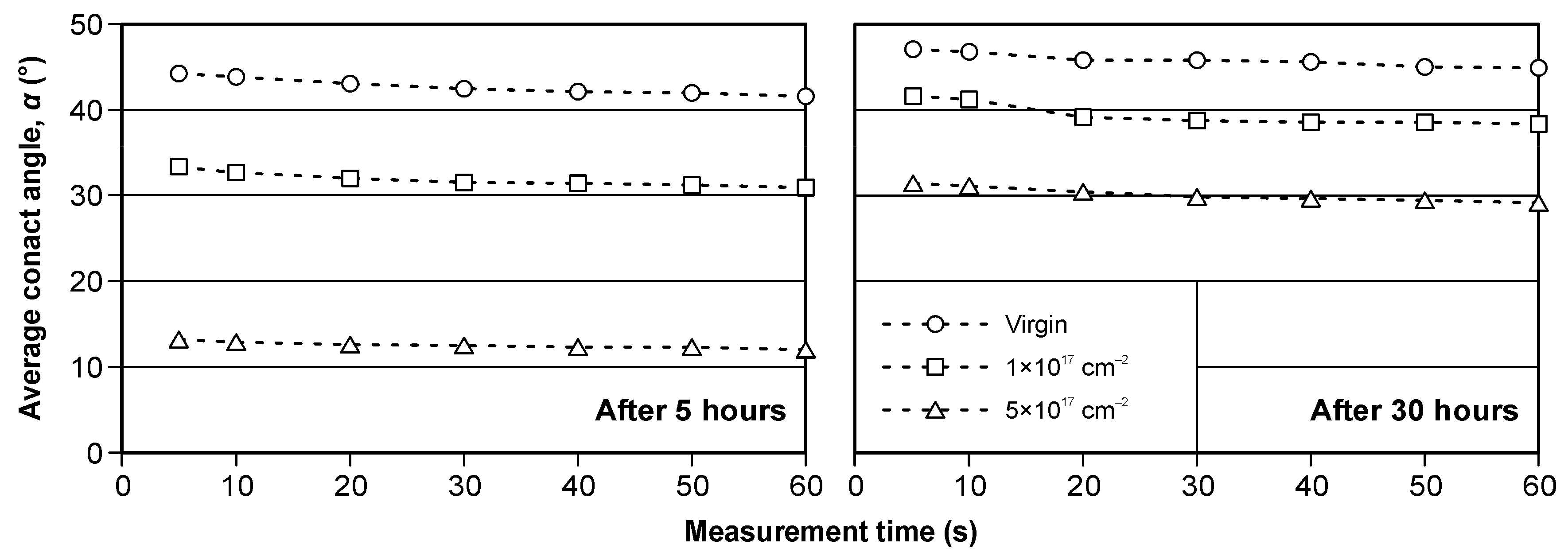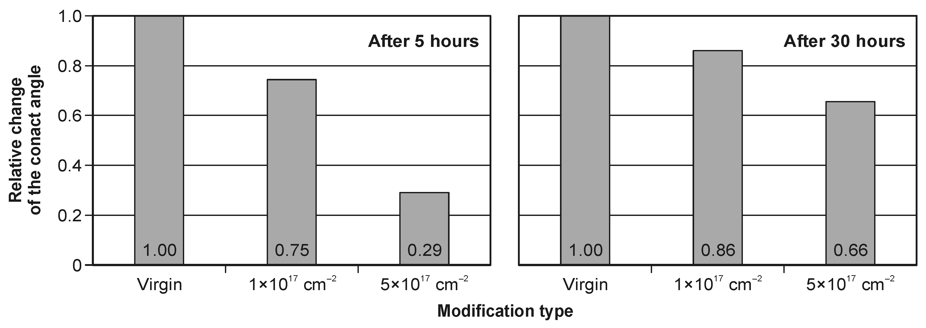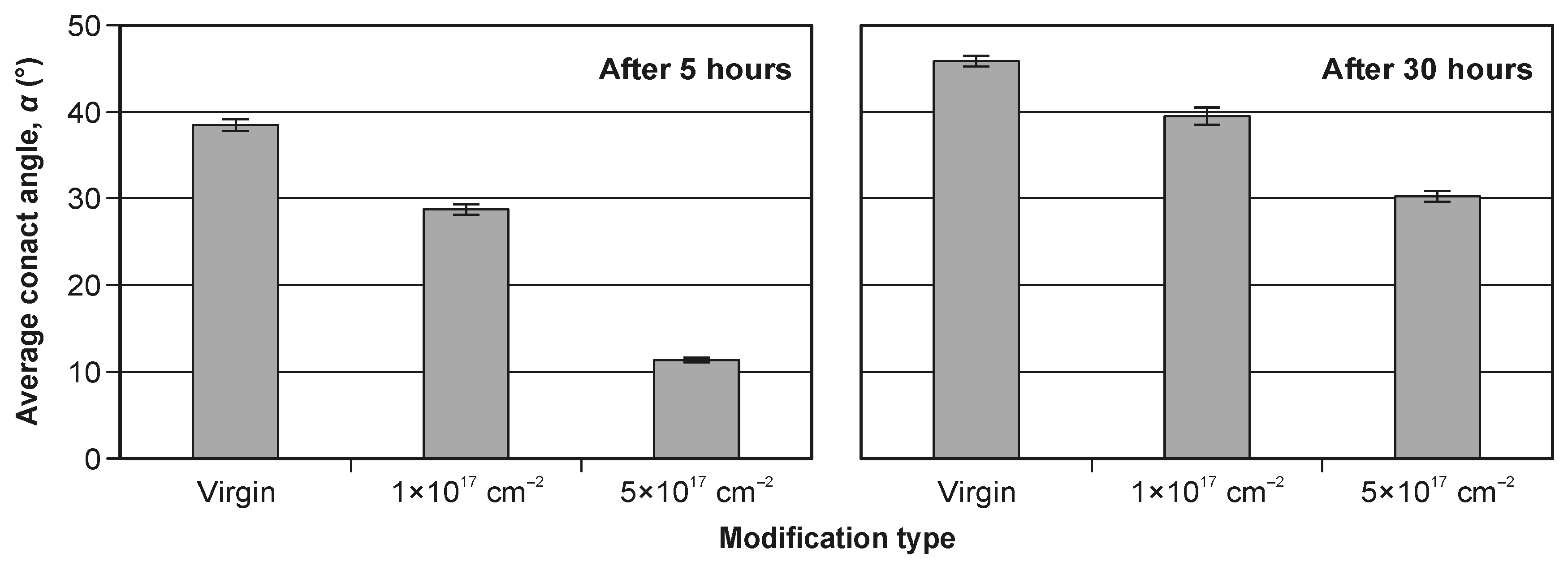 - With an increase in the implanted dose, the value of the contact angle decreases significantly. A five-times-higher dose results in a more than three-times reduction in the contact angle.