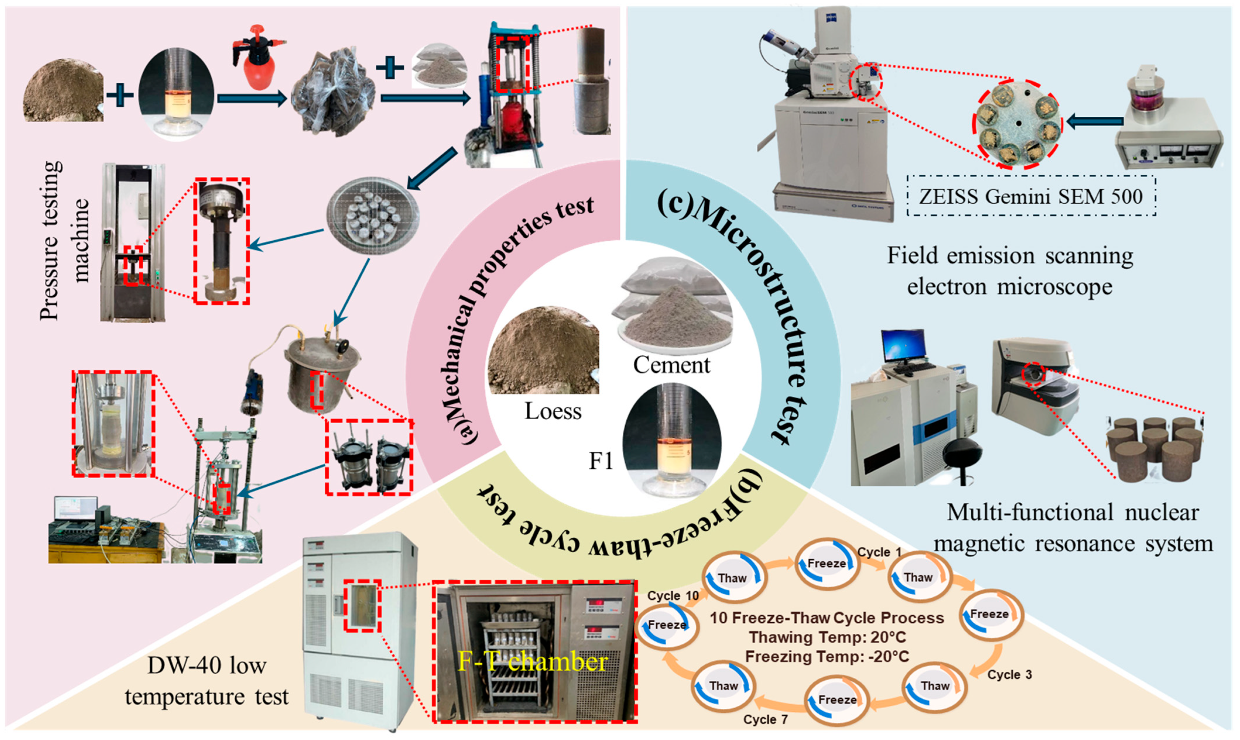 - Niu, Y.; Hou, L.; Qin, Z.; Wang, X.; Zhang, Y.; Shao, W.; Jiang, G.; Guo, X.; Zhang, J. Mechanical properties and constitutive model of the cement-improved loess under freeze-thaw conditions. Materials 2022, 15, 7042. [Google Scholar] [CrossRef]