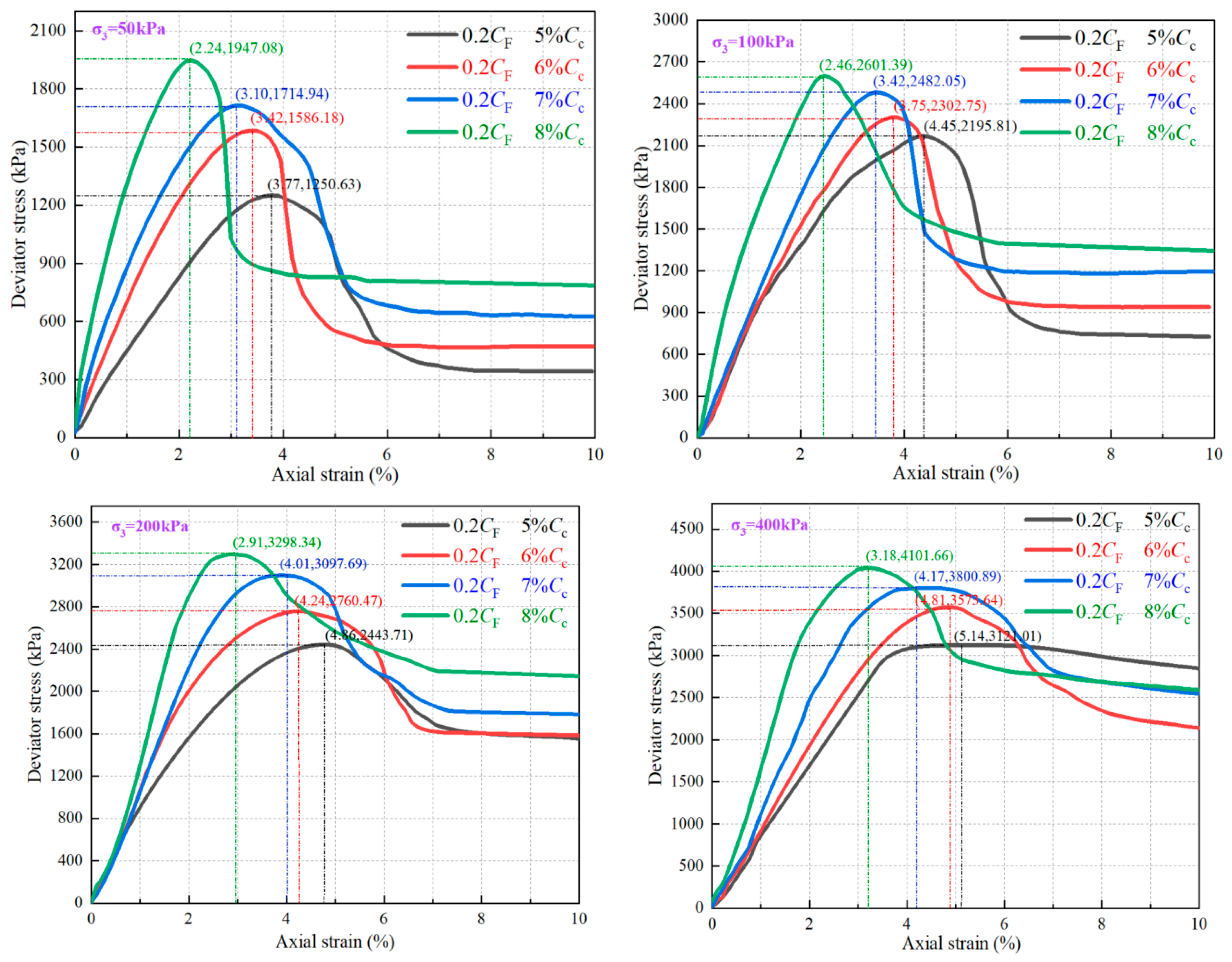 3.2. Effect of Cc on FCIL Stress–Strain Relationship
