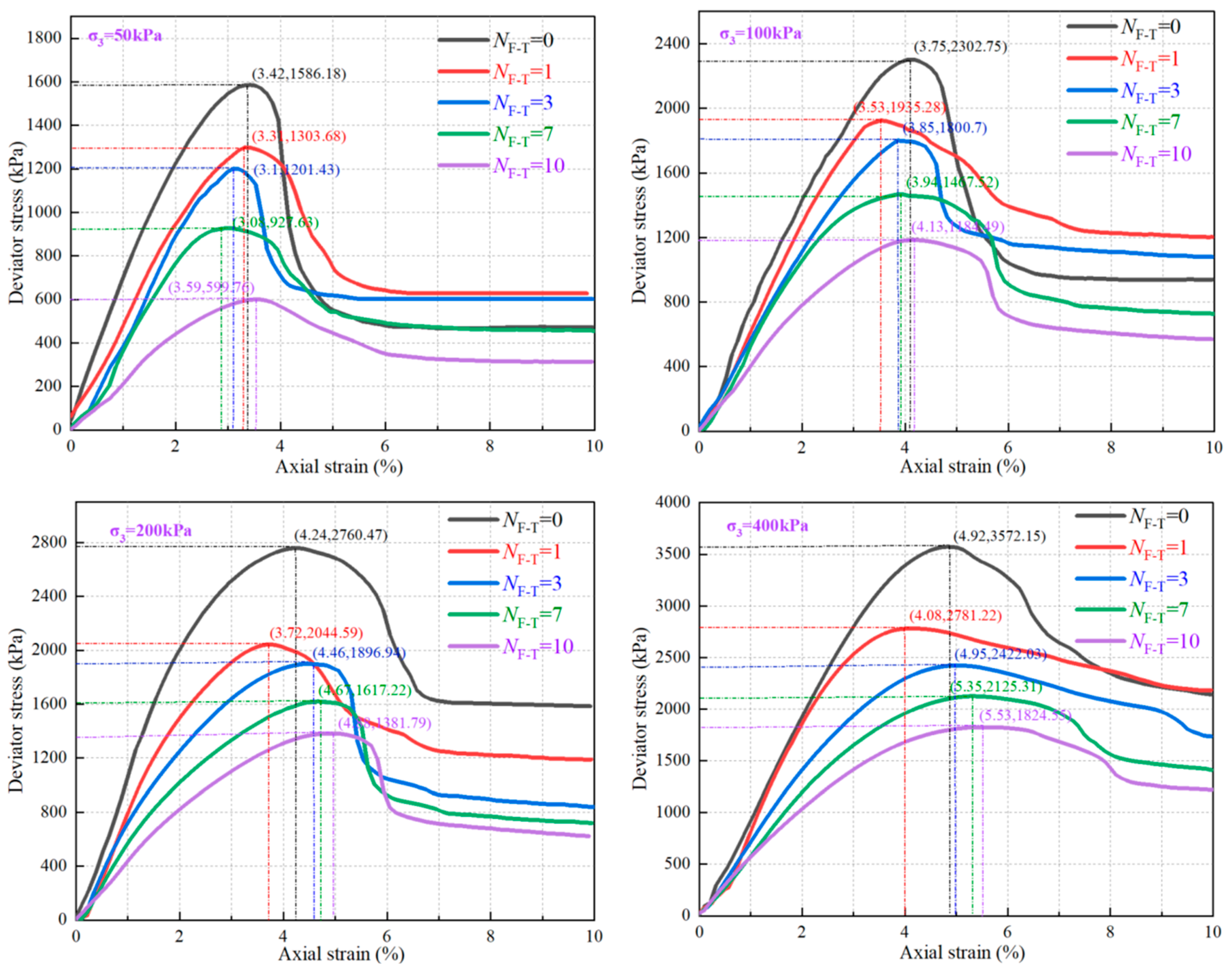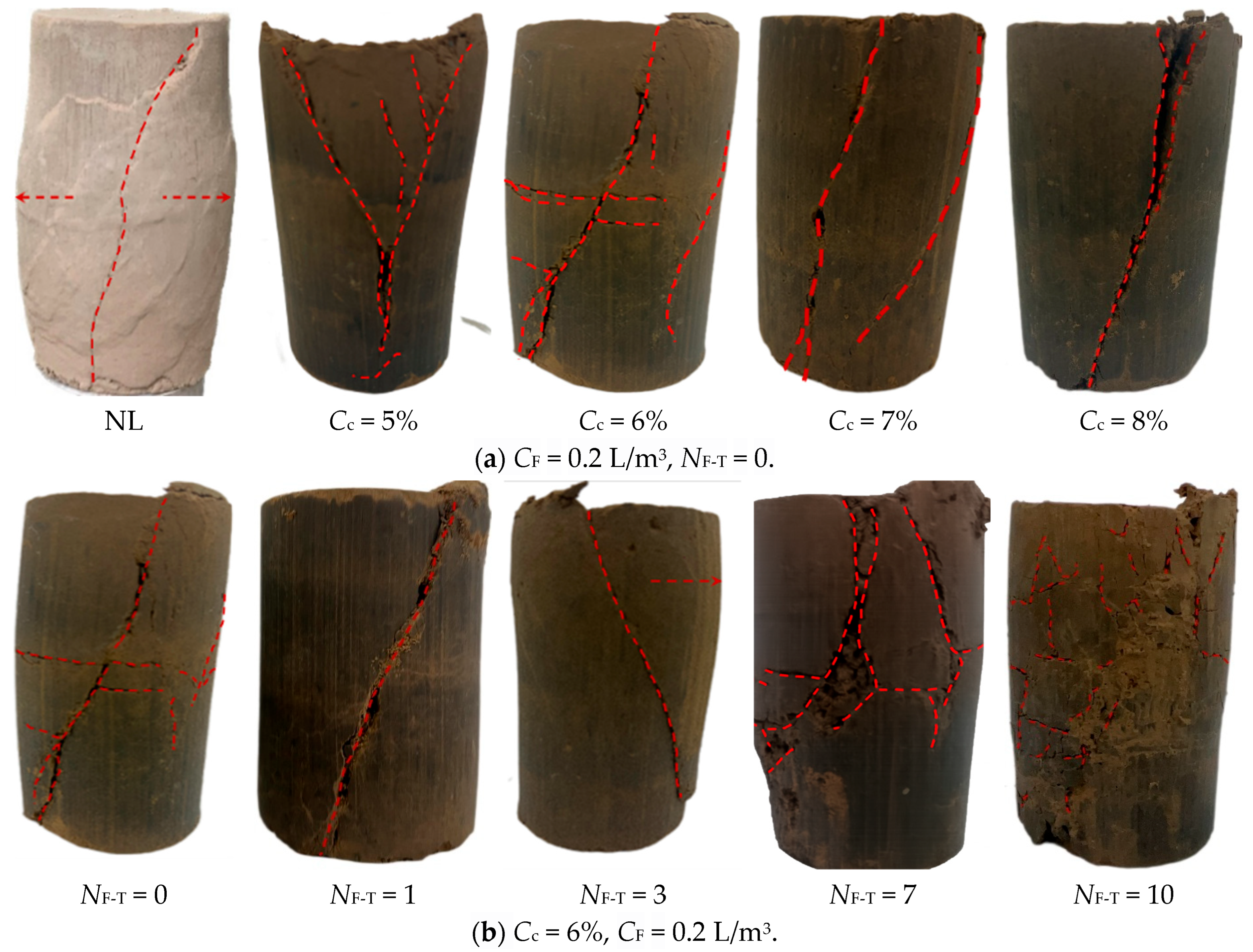 - Compared with CF = 0 L/m3 (Cc = 6%), when CF = 0.2, 0.3, and 0.4 L/m3, the UCS of FCIL increased by 48.89%, 73.33%, and 108.11%, respectively, and the corresponding εf increased by 56.28%, 108.38%, and 61.07%, respectively. With increasing Cc, enhanced interparticle cementation significantly increases the c of FCIL, resulting in higher stiffness and a more brittle failure behavior of the specimens, whereas the increase in φ is relatively limited. With increasing NF-T, numerous intersecting cracks develop on the lateral surface and top of the specimens; the single shear plane gradually transitions into a crushed shear band, and the bulging phenomenon becomes more pronounced. Accordingly, the stress–strain curves exhibit a plastic failure feature characterized by a marked decrease in qmax and a flatter post-peak response.