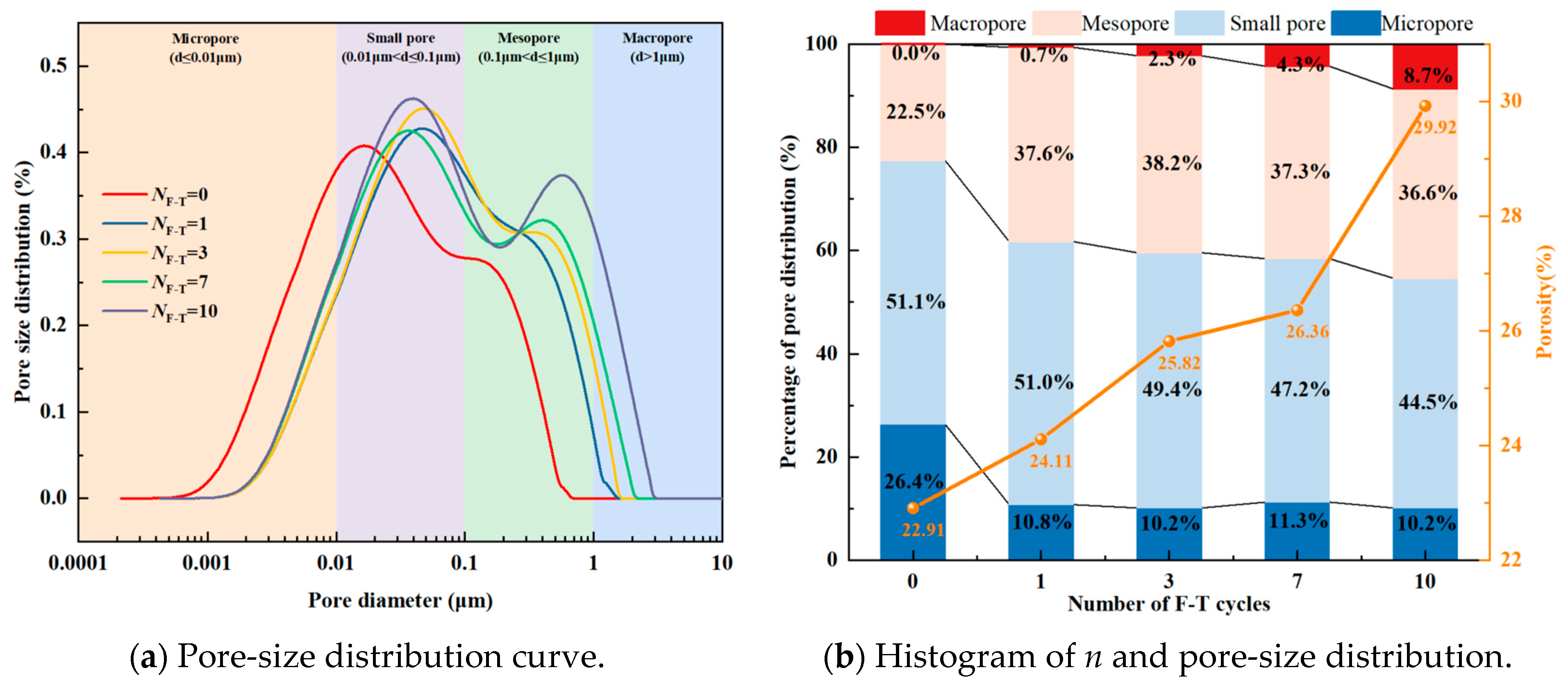 - NMR and SEM analyses indicate that, after improvement with cement and F1, the proportions of small and medium pores, as well as the n, decreased significantly, whereas micropores increased and large pores almost disappeared. With increasing NF-T, the proportions of medium and large pores and n increased markedly, while small pores and micropores decreased, indicating that the pore-size distribution evolved toward medium and large pores. F1 can thin the water film and reduce interparticle spacing through ion exchange. Cement hydration products can bond soil particles and fill interparticle pores, while the sulfonated oil component of F1 forms a hydrophobic barrier that suppresses water migration and microcrack propagation. Consequently, the pore structure of loess is substantially improved, leading to enhanced strength and improved stability against freeze–thaw cycling.