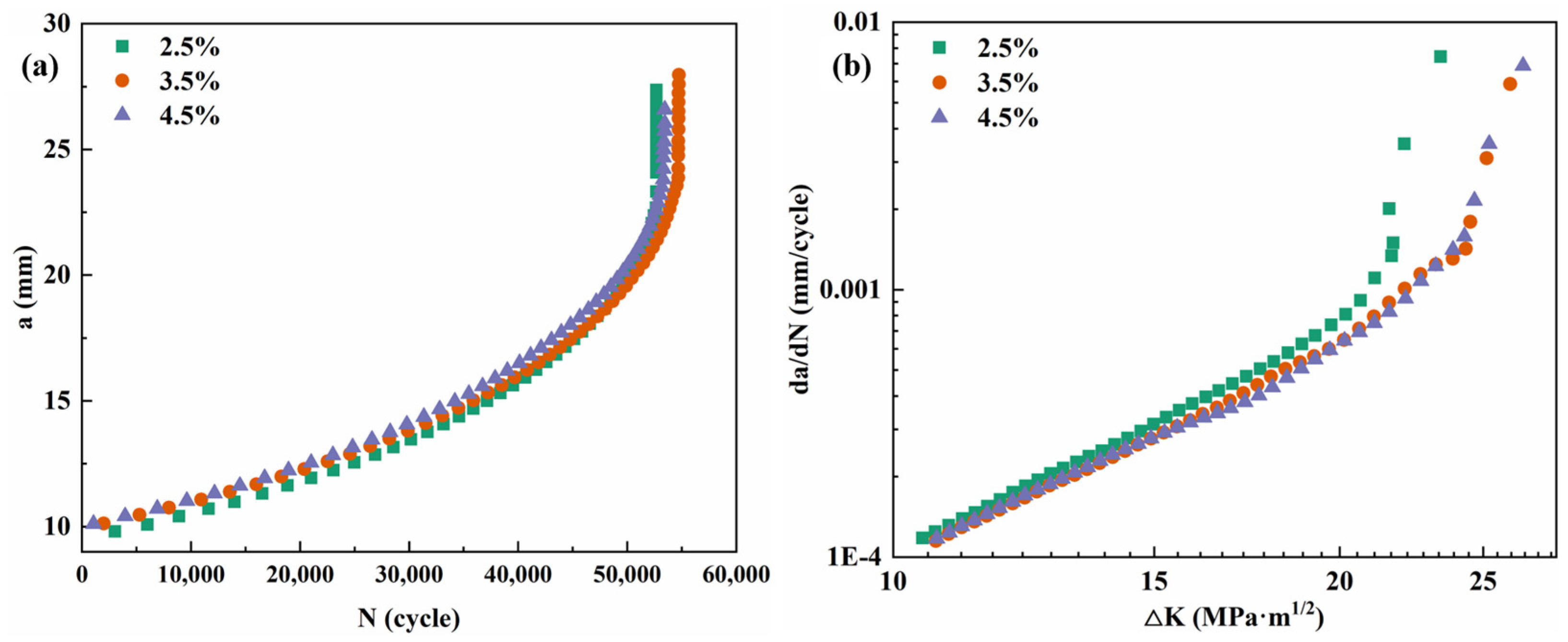 - GB/T 6398-2017; Metallic Materials—Fatigue Testing—Fatigue Crack Growth Method. National Standard of the People’s Republic of China: Beijing, China, 2017.