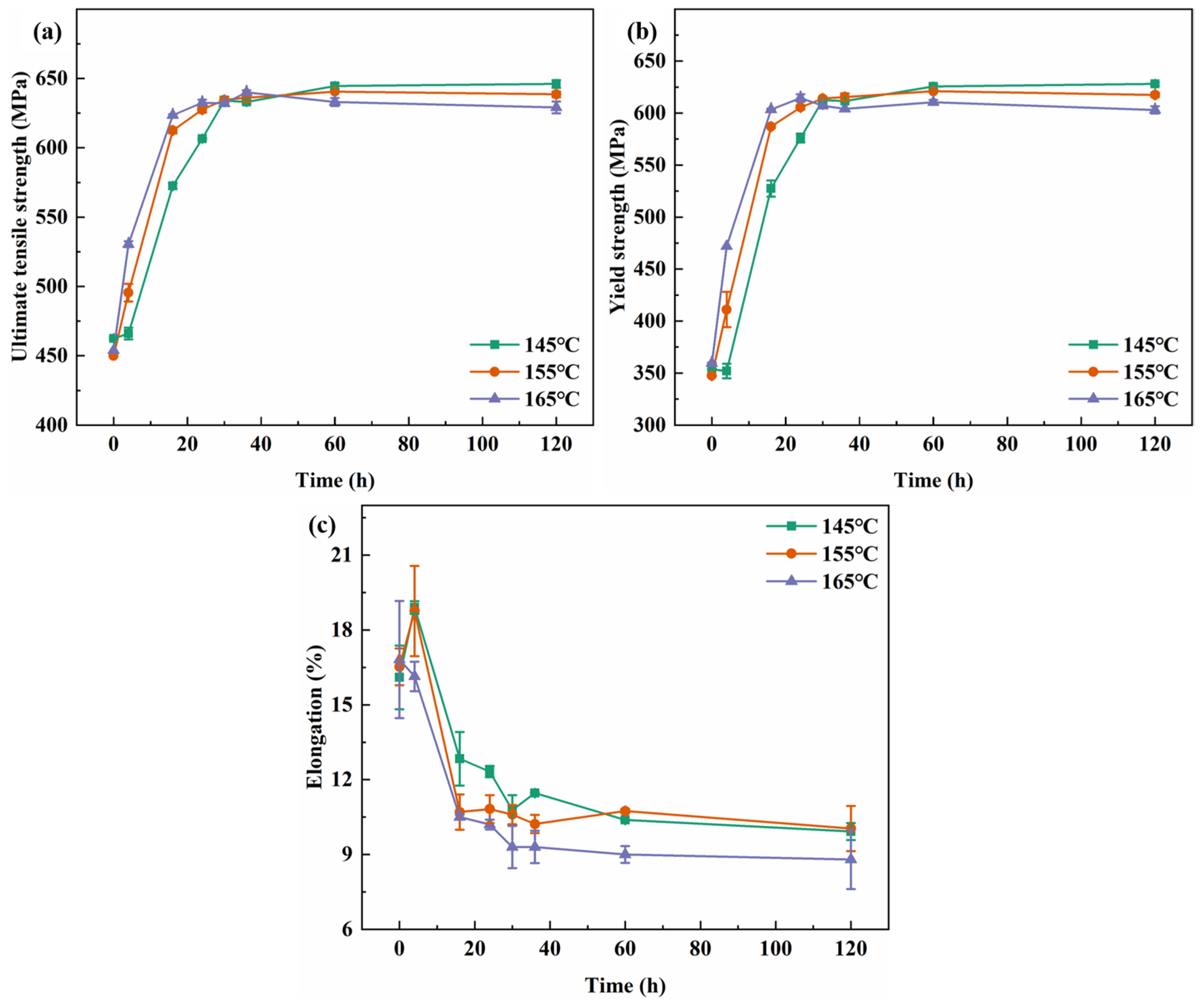- The microstructure–property relationship of the alloy indicates that, by appropriately controlling the pre-stretching deformation (3.5~4.5%) and aging temperature (145~155 °C), the size, distribution, and grain boundary characteristics of the precipitates can be optimized. This enables a synergistic enhancement of high strength and excellent damage tolerance.