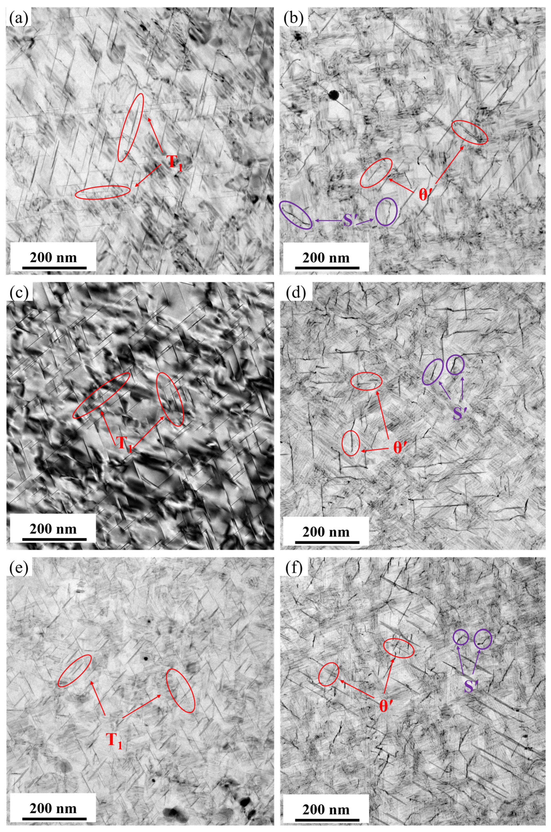 - Deng, S.X.; Li, J.F.; Wang, L.; Chen, Y.Y.; Xiang, Z.W.; Ma, P.C.; Chen, Y.L.; Liu, D.Y. Strengthening mechanism of T8-aged Al-Cu-Li alloy with increased pre-deformation. Trans. Nonferrous Met. Soc. China 2024, 34, 3151–3169. [Google Scholar] [CrossRef]
