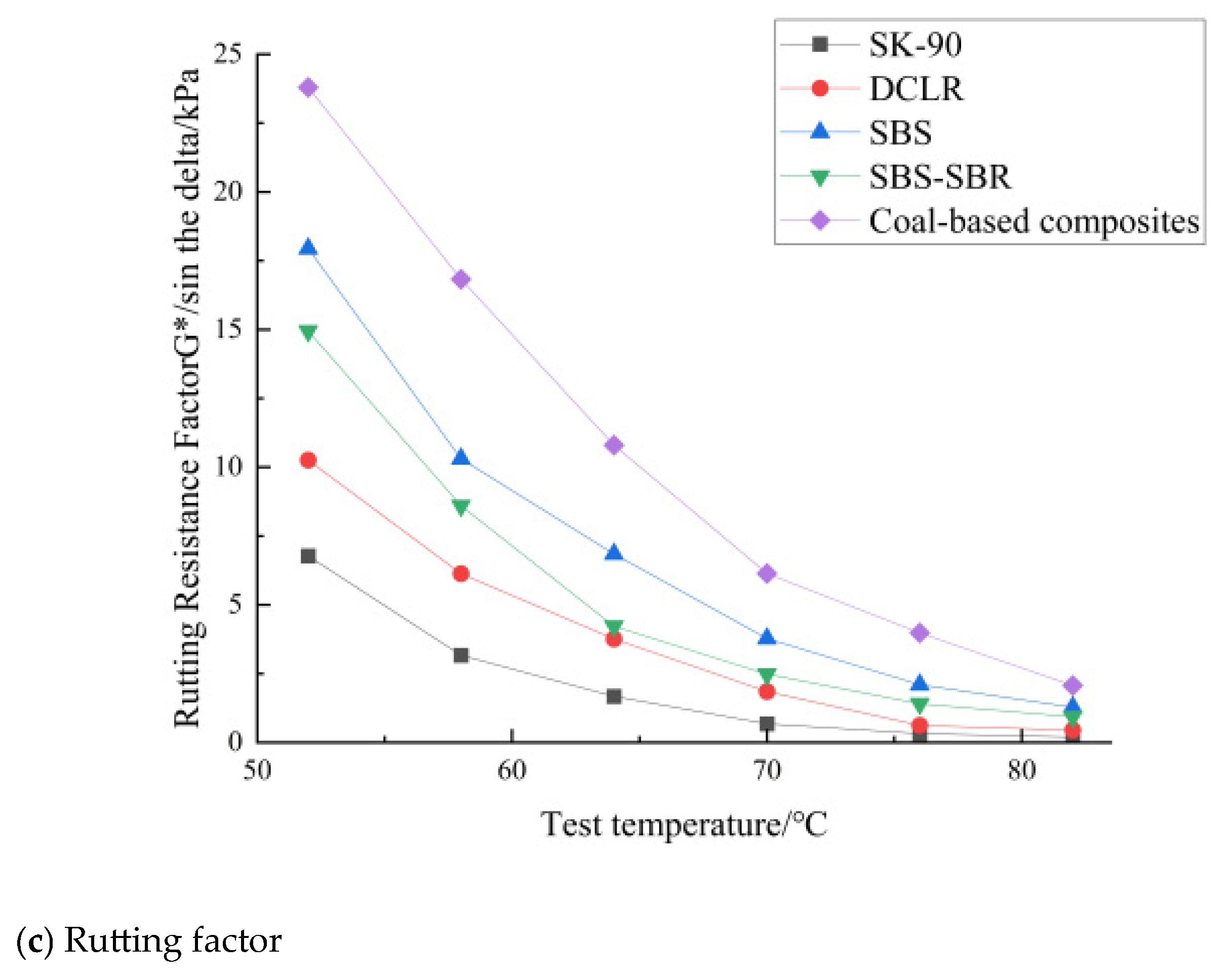 - DCLR dosage is the primary factor affecting the high-temperature rigidity and low-temperature ductility of asphalt, SBS dosage dominates the improvement of the system’s cross-linked network density and high-temperature viscosity, and SBR dosage is the key to regulating the low-temperature flexibility of the composite asphalt. This quantitative analysis of the factor influence law provides a scientific method for the formula design of multicomponent composite-modified asphalt.