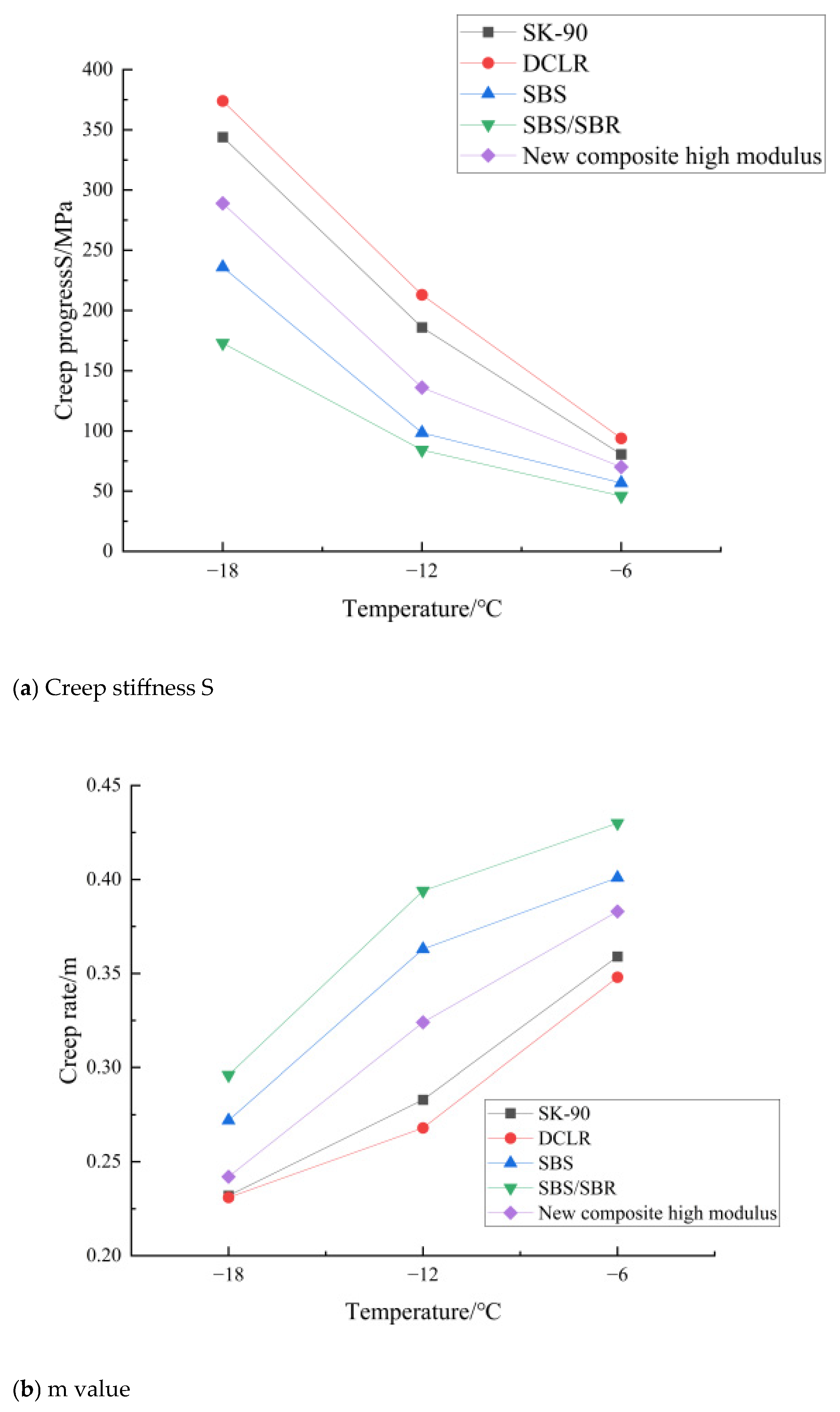 - Wang, T.; Wei, X.; Zhang, D.; Shi, H.; Cheng, Z. Evaluation for low temperature performance of SBS modified asphalt by dynamic shear rheometer method. Buildings 2021, 11, 408. [Google Scholar] [CrossRef]
