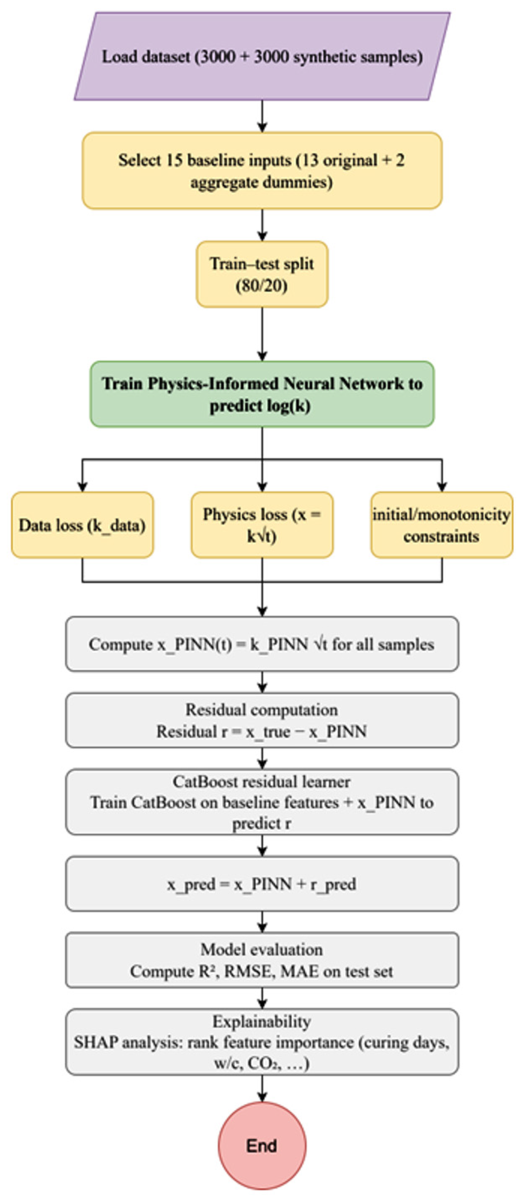 2 concentration, relative humidity, and temperature. The review also highlighted the advantages of using finite element models, especially those that include the effects of chemical kinetics, although the limitations of using simple t-law models in long-term extrapolations were also mentioned. In this context, the present study proposes a novel approach that combines the advantages of both types of models, as identified in the review. Most of the models reviewed in the paper can be classified as either purely mechanistic or purely black-box models, although the proposed PINN-CatBoost approach combines the governing equation with the data, as in the purely black-box models, yet also addresses the issue of nonlinear effects, as identified in the review. The proposed approach, therefore, allows accurate prediction over a greater range of depths as well as datasets, as covered in most of the models reviewed in the pa-per but also allows for the interpretation of results, as provided by SHAP values, thus overcoming one of the major limitations of ANN models, as identified in the review. The proposed approach, therefore, combines the advantages of both types of models, as identified in the review, thus providing a robust approach that can be used in long-term carbonation assessments.