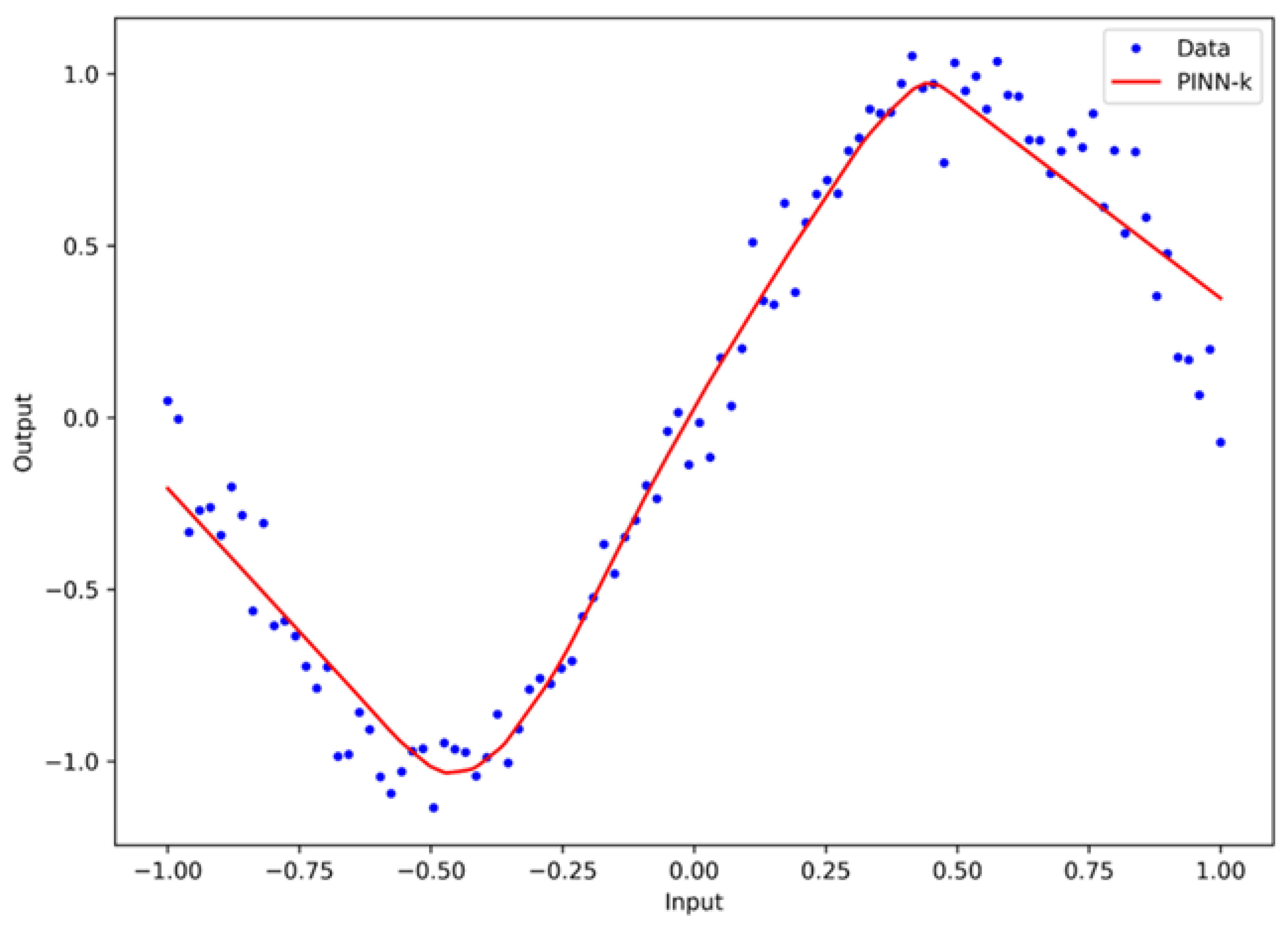 Figure 3, the data points have a nonlinear distribution around the central trend line. This is due to the stochastic nature of the microstructural porosity of the concrete and the addition of 3% controlled Gaussian noise. The high degree of scatter from the central trend line reflects the variability in the porosity and noise. The red line (PINN-k) shows the model’s compliance with the fundamental law of square-root time. This is ensured by penalizing the model’s deviations from the initial conditions and the monotonicity constraints. The vertical distance between the blue dots and the red line represents the residual error (