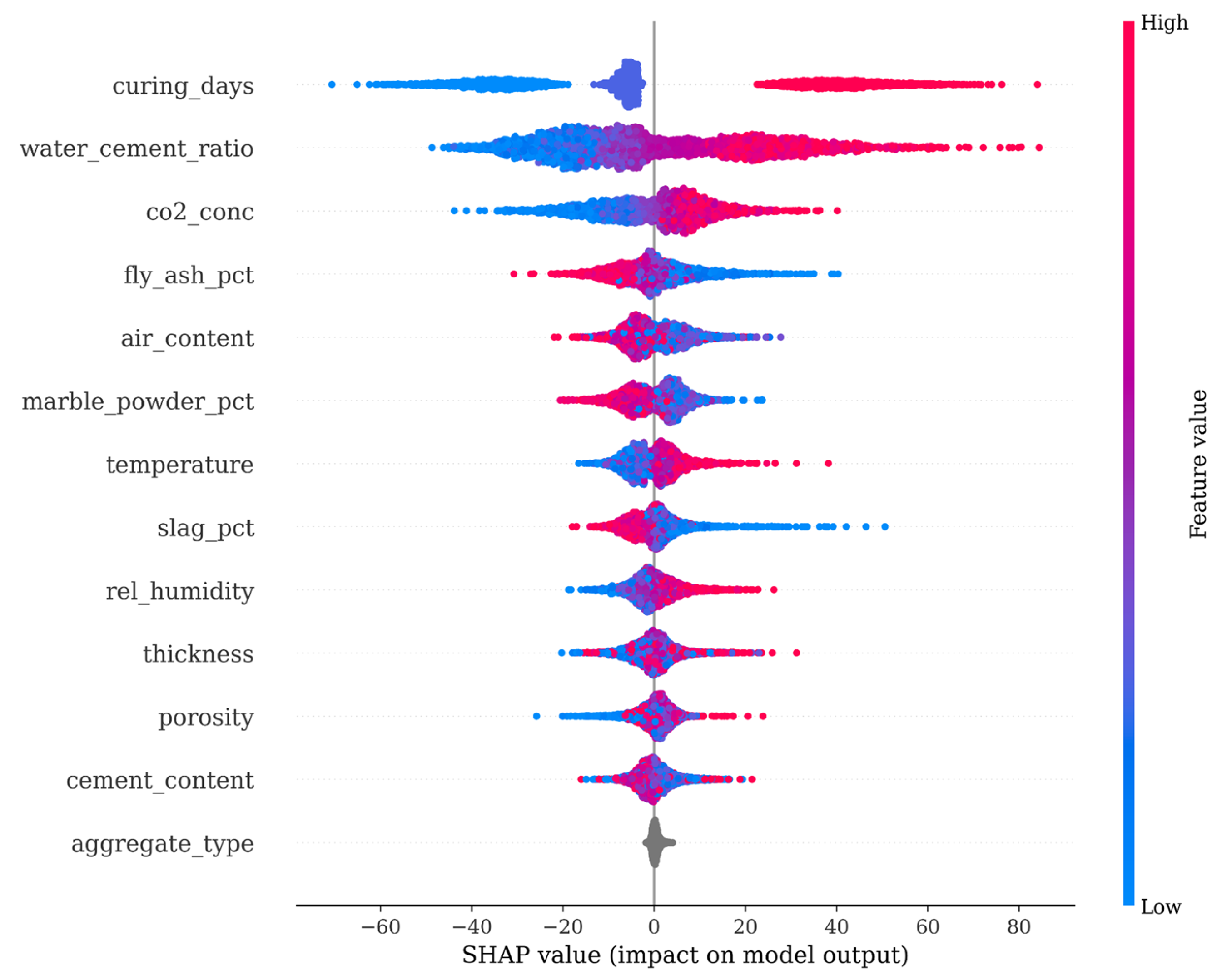 The SHAP values on the horizontal axis of the SHAP plot are given in the same units as the target variable (mm carbonation depth) and represent the degree to which the feature value increases or decreases the prediction relative to the average. It is important to emphasize that the curing duration considered in the SHAP analysis refers to the hydration period before carbonation exposure, whereas carbonation exposure time is handled separately within the physics-based formulation (1). Therefore, the SHAP analysis captures how material preparation variables, such as curing duration, w/c ratio, and SCM content, affect the estimated carbonation coefficient k, rather than describing the time-dependent progression of the carbonation process itself. Even though the linear correlation between the carbonation depth and the number of curing days is only 0.52, the SHAP plot shows that the points for longer curing periods (red color) have negative SHAP values, i.e., they decrease the predicted carbonation depth.