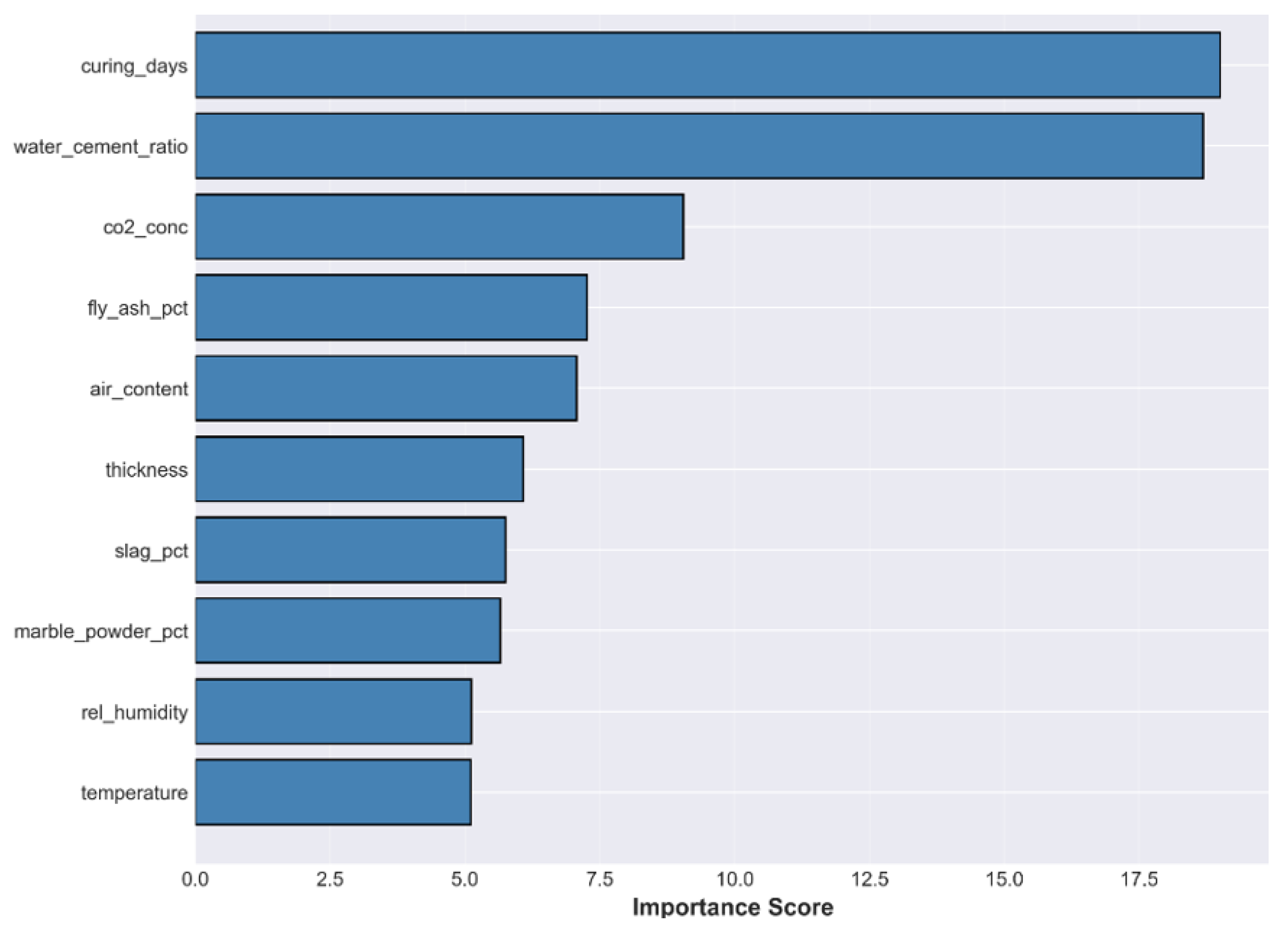 Figure 5 confirms that, after the curing days and the water–cement ratio, the next important variables for reducing the residual error left over by the physics-based Stage 1 model are the CO