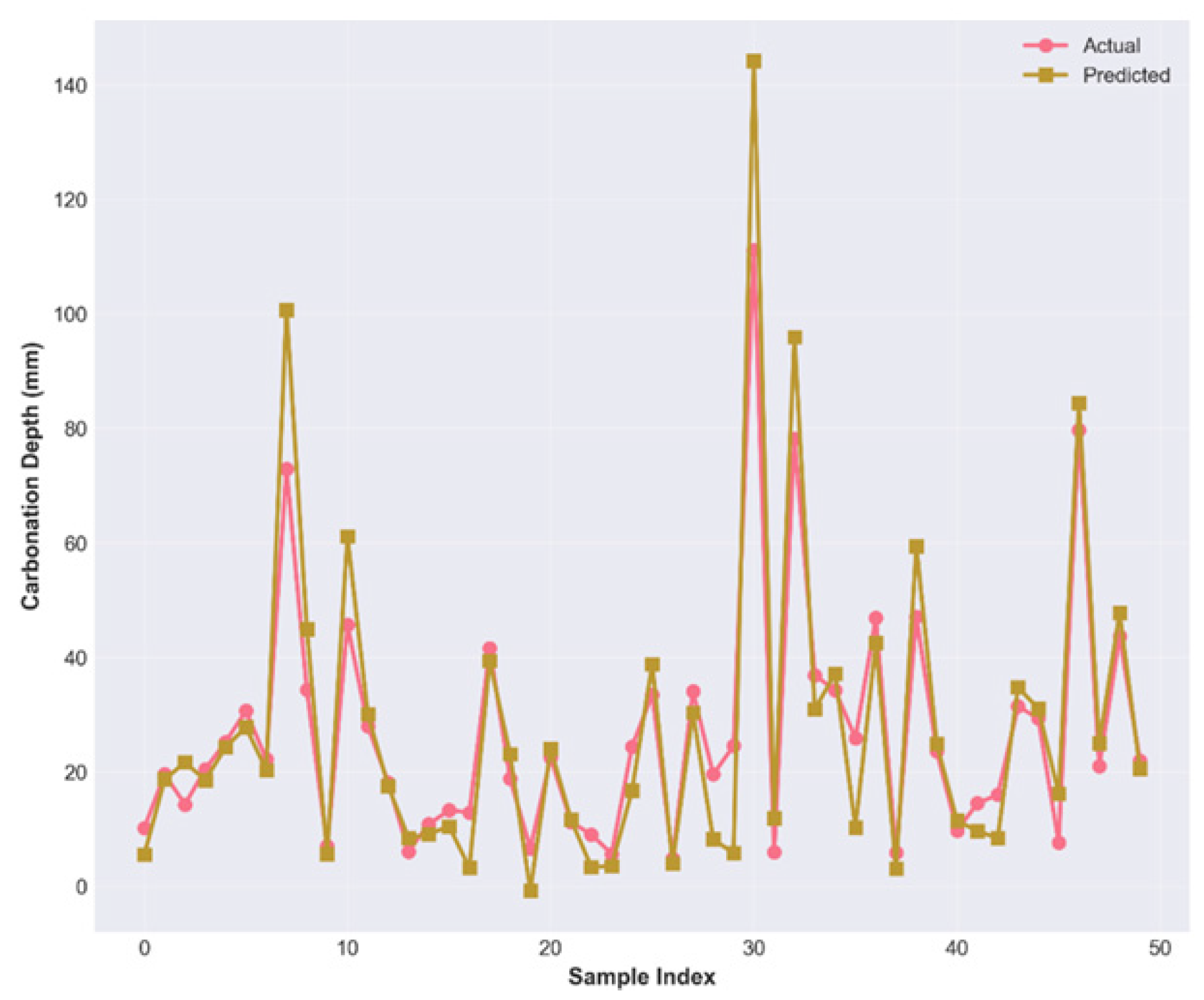Figure 6 presents the sequential prediction performance of the model across 50 randomly selected test samples, displaying the actual carbonation depth measurements (red/green markers) overlaid with model predictions (yellow/orange markers), connected by lines to visualize prediction trajectories.