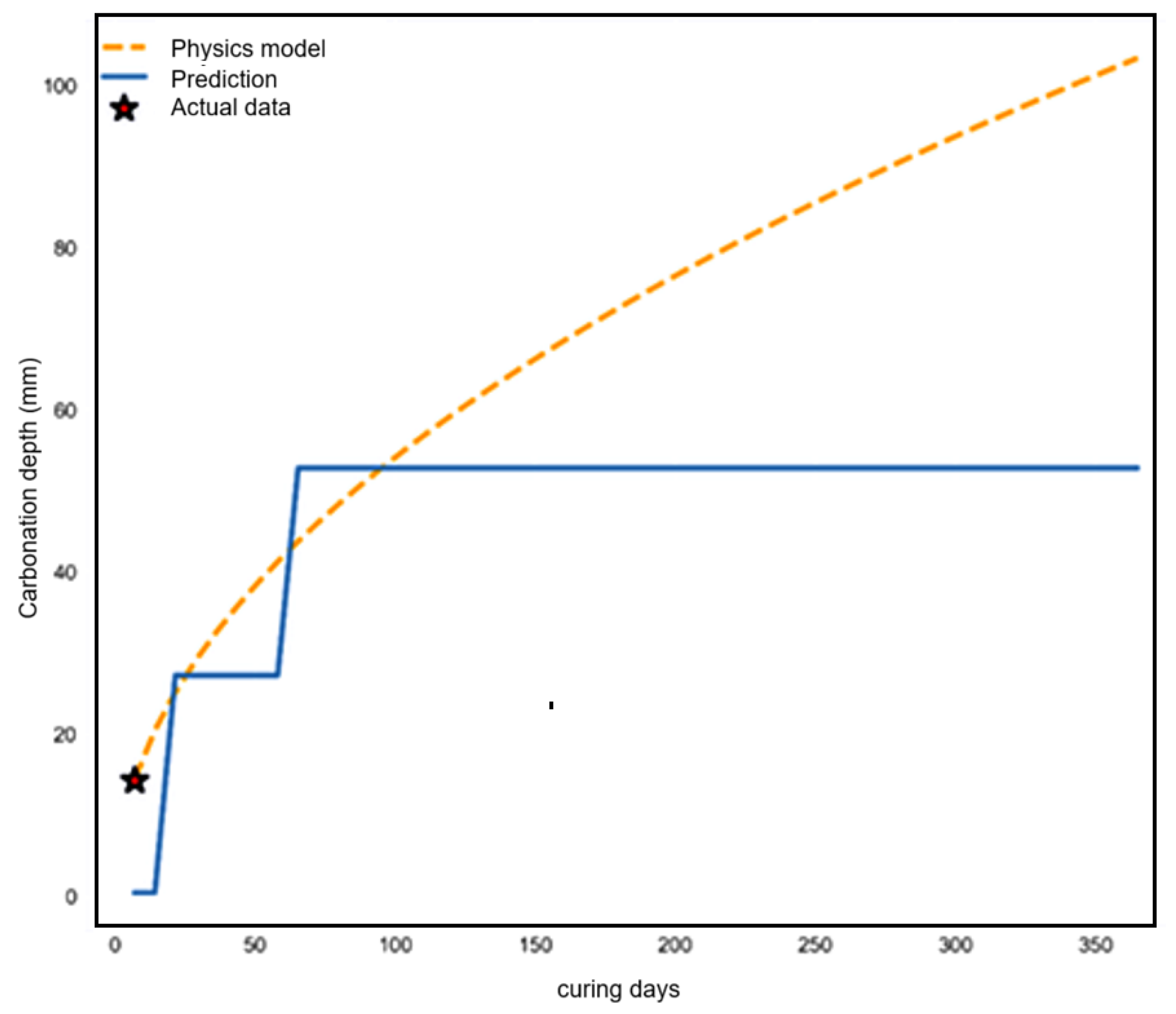 Figure 8), which compares predictions to the theoretical square root of the time law (1) (orange dashed curve), is used to assess the model predictions for their compliance with physical laws over longer periods of time. The predictions increase from 0 to 27 mm over the first 7 days and then plateau at 52 mm until day 365. This is characteristic of the baseline model predictions, which tend to cluster in discrete time categories rather than following the continuous nature of the diffusion process.