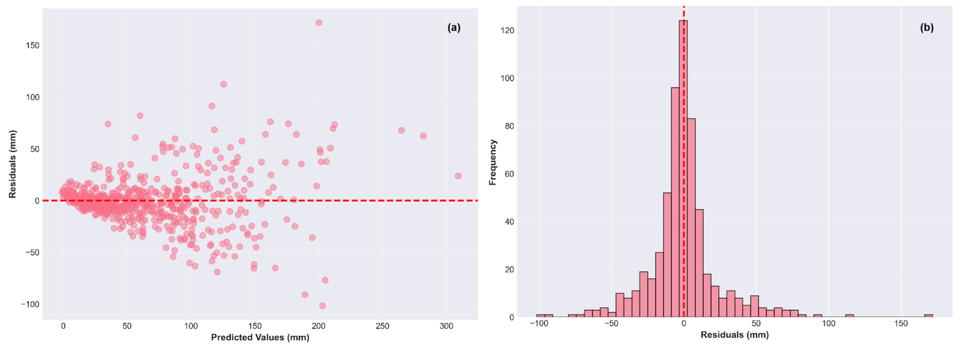 Figure 10a shows that residual form widening cone, where low predictions (<100 mm) exhibit ±20 mm errors while high predictions (>250 mm) generate ±80 mm deviations. The histogram is almost symmetrical (μ = 0.09 mm), with the standard deviation σ = 3.59 mm, and minimal tail probability beyond ±3σ.