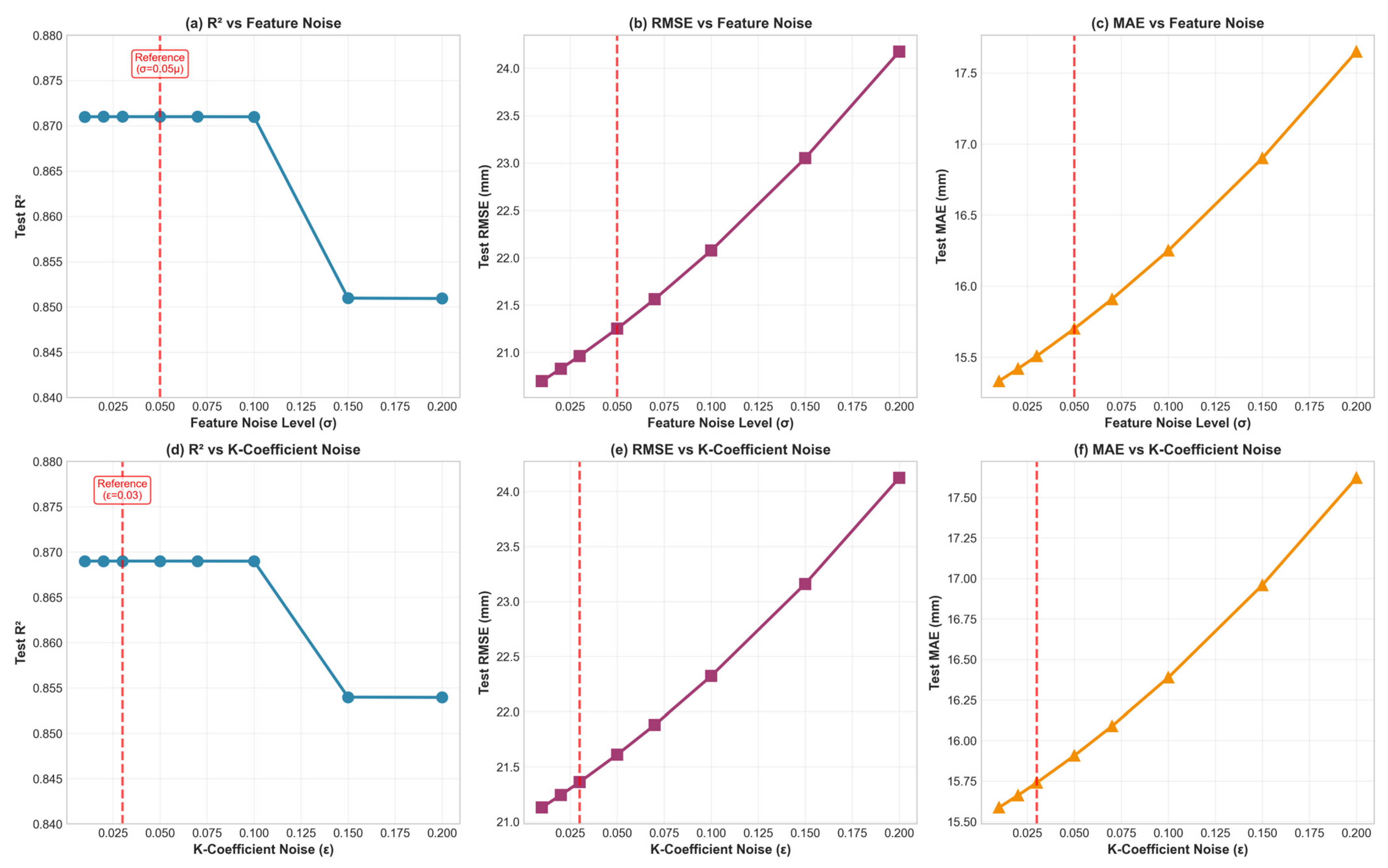 We remark that the model’s predictive performance remains stable under moderate noise levels around the reference configuration (σ = 0.05μ and ε = 0.03). The coefficient of determination stays nearly unchanged (