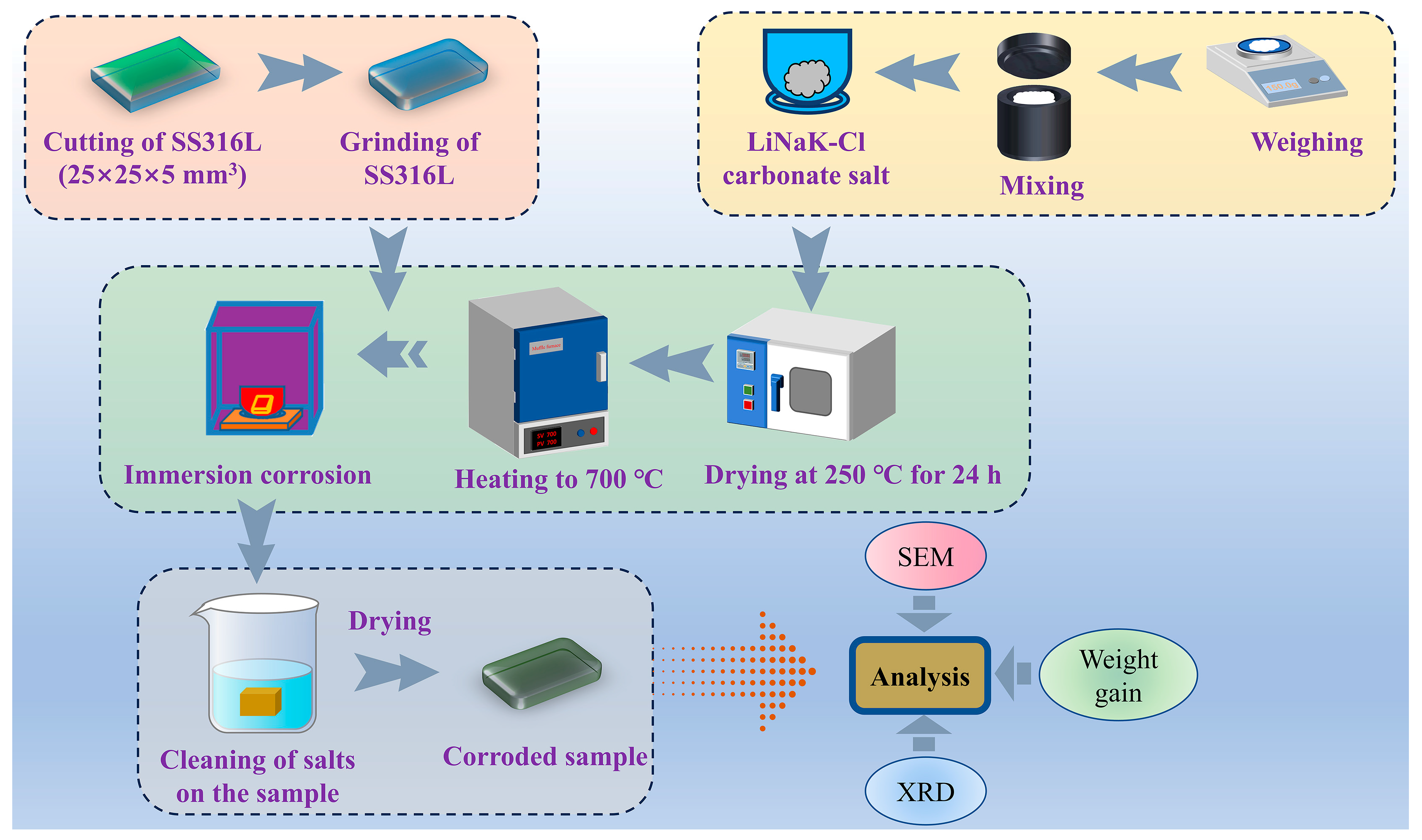- Dong, J.; Zhao, C.Y. Corrosion behavior of alloys in Li2CO3-K2CO3 eutectic salt under an Air-then-Argon condition. Sol. Energy Mater. Sol. Cells 2025, 290, 113671. [Google Scholar] [CrossRef]