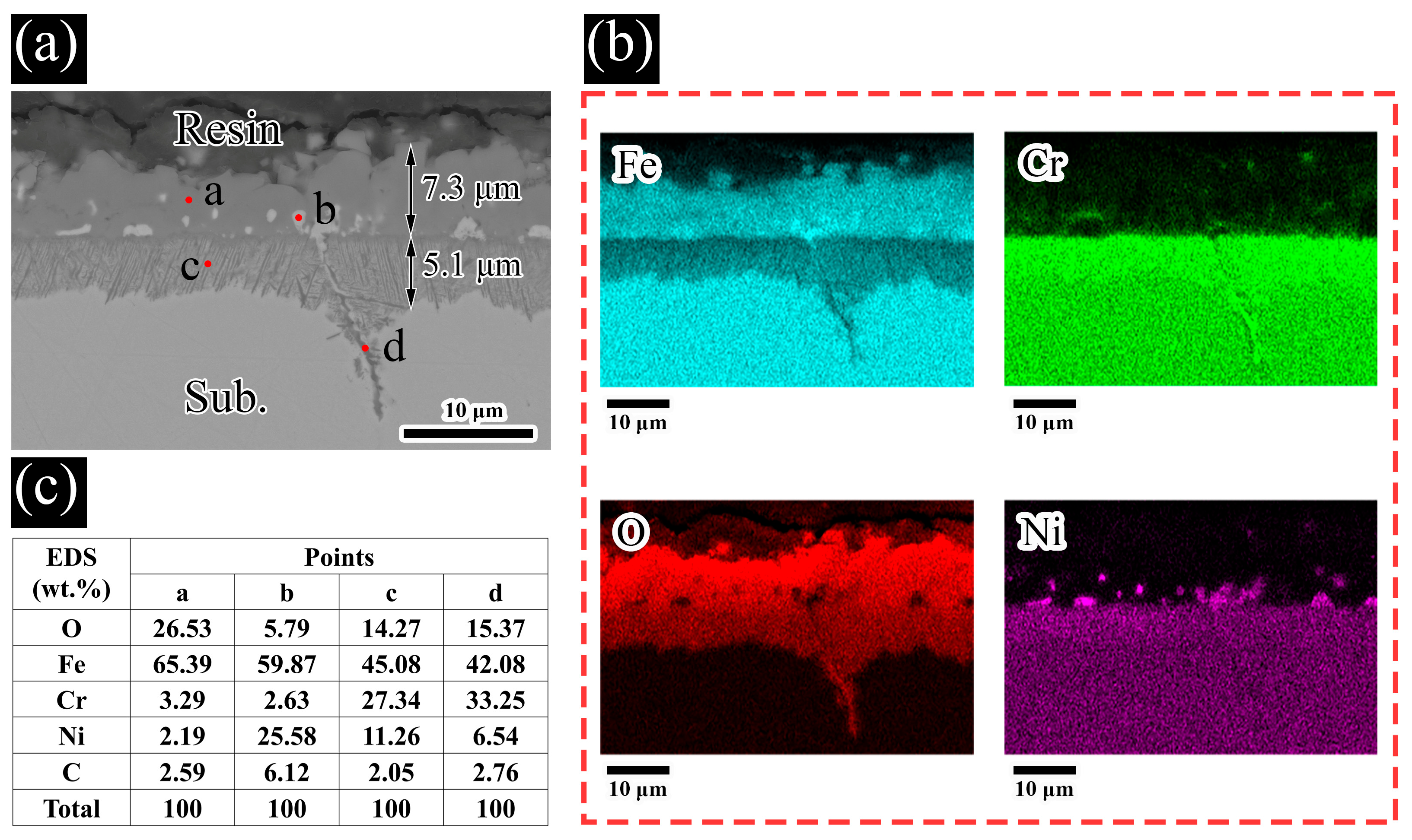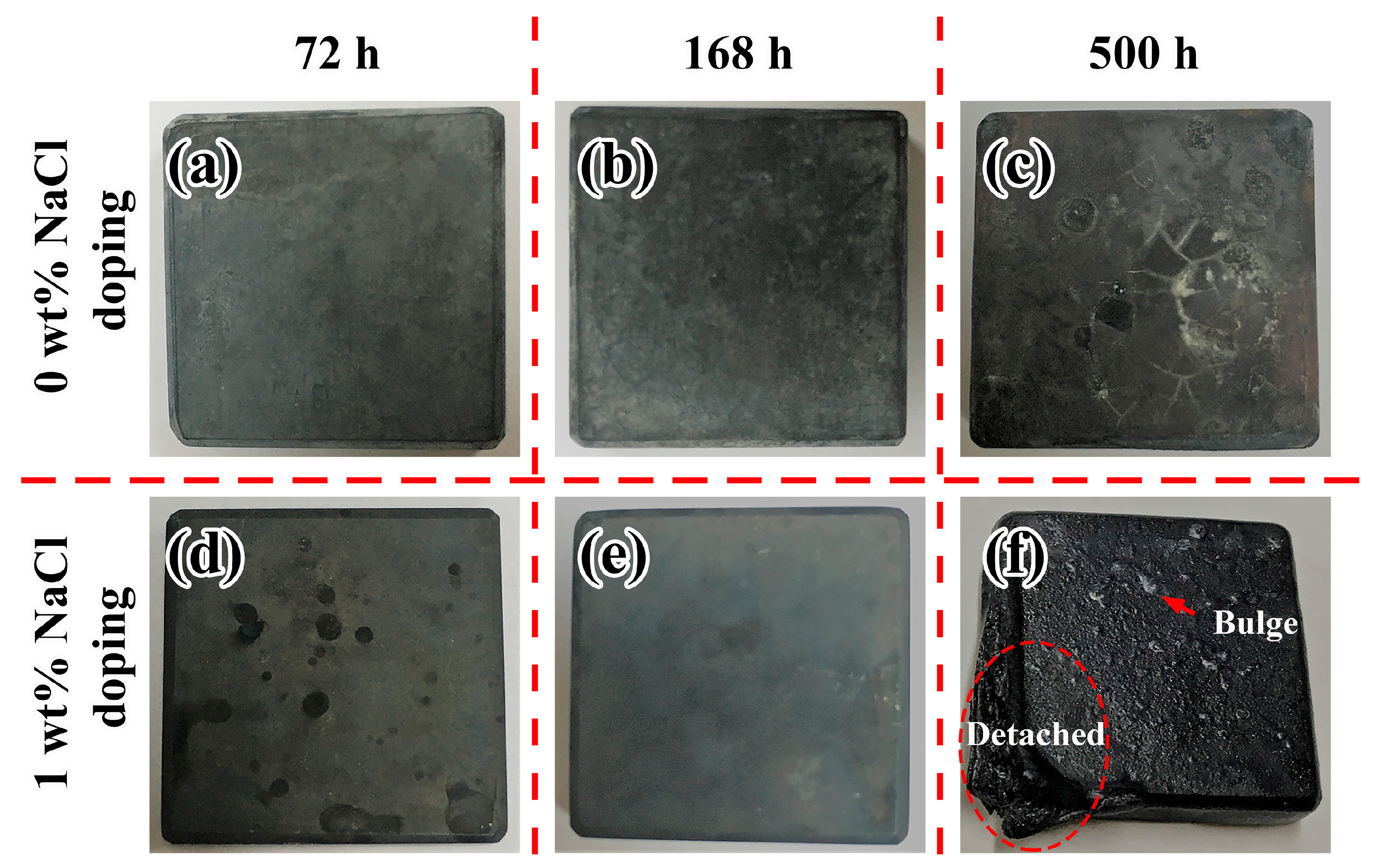 - Continuous outward migration of Cl2 and metal chlorides weakens the adhesion of the corrosion layers, resulting in prominent pores, transverse cracks, wrinkling, and partial peeling of the oxide scales, which in turn accelerates corrosion of the underlying substrate.