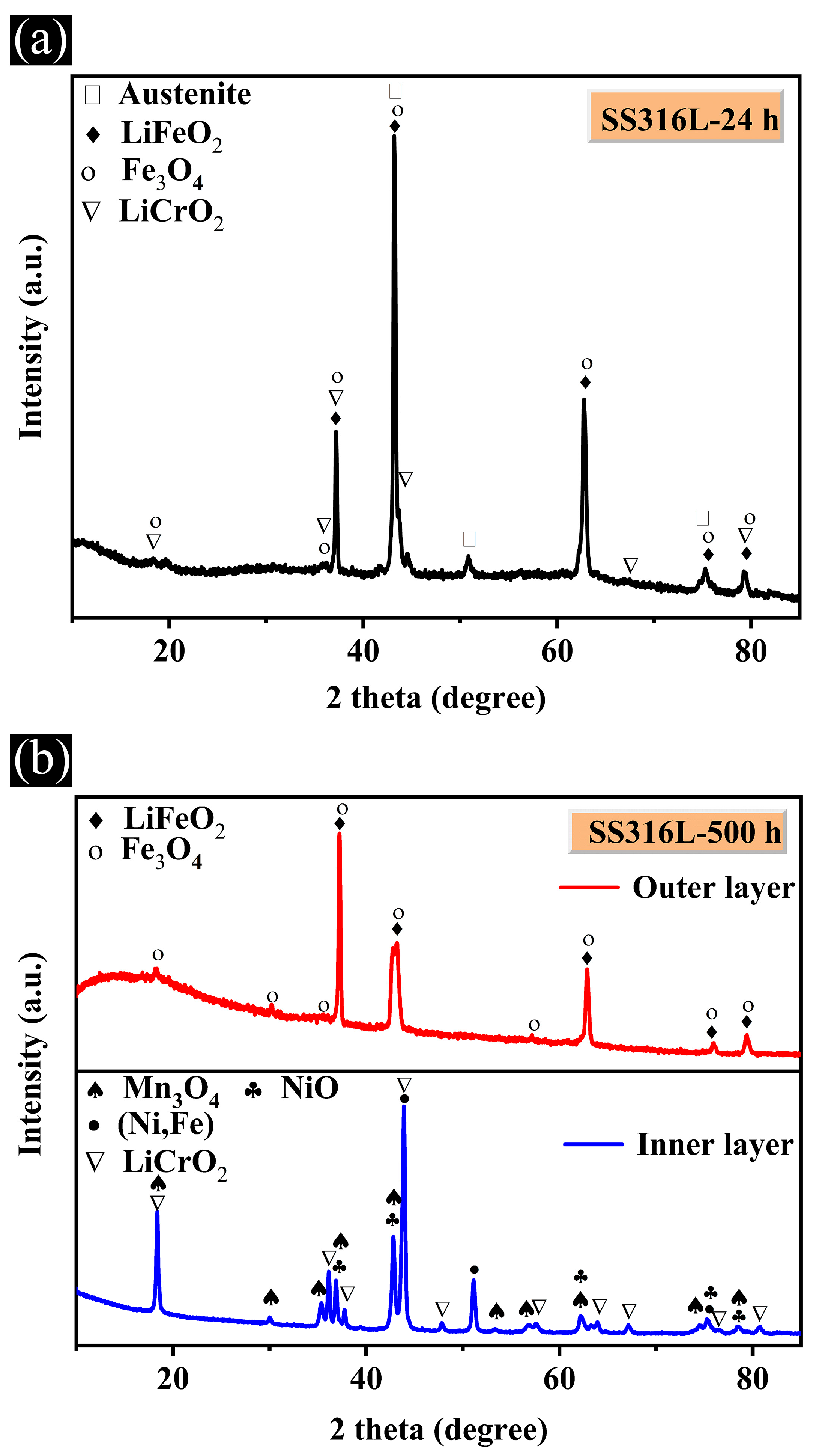 - Transverse cracks along the grain boundaries and micropores were observed in the inner corrosion layer of the SS316L samples immersed in molten LiNaK-Cl carbonate salt at 700 °C. Furthermore, no Cl-rich regions were observed throughout the corroded samples, which is consistent with the proposed mechanism involving transient participation of Cl− during the corrosion process.