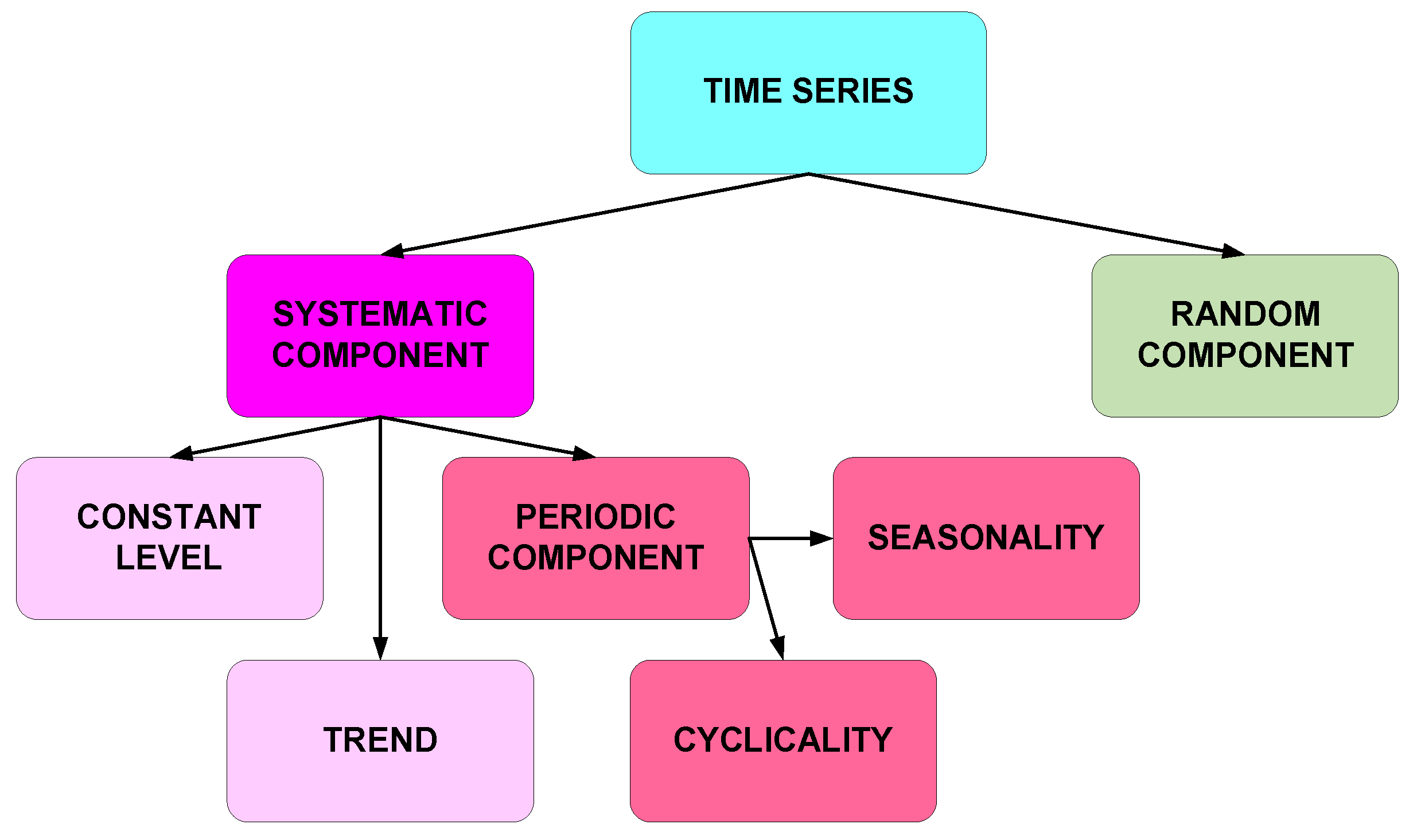 The analysis of a time series begins with determining its type, by exploration of signal components. In most cases, any time series will be characterized by the presence of two basic components: a deterministic and a random component. The deterministic component can be characterized by a constant value of the variable, locally monotonic trend, periodically occurring seasonal or cyclical fluctuations. The periodic component can occur together with a constant level of the value of the variable or with a trend. Depending on the phenomenon or process under consideration, the influence of these components on the unraveling sequence of values will vary. The components of the time series are shown in