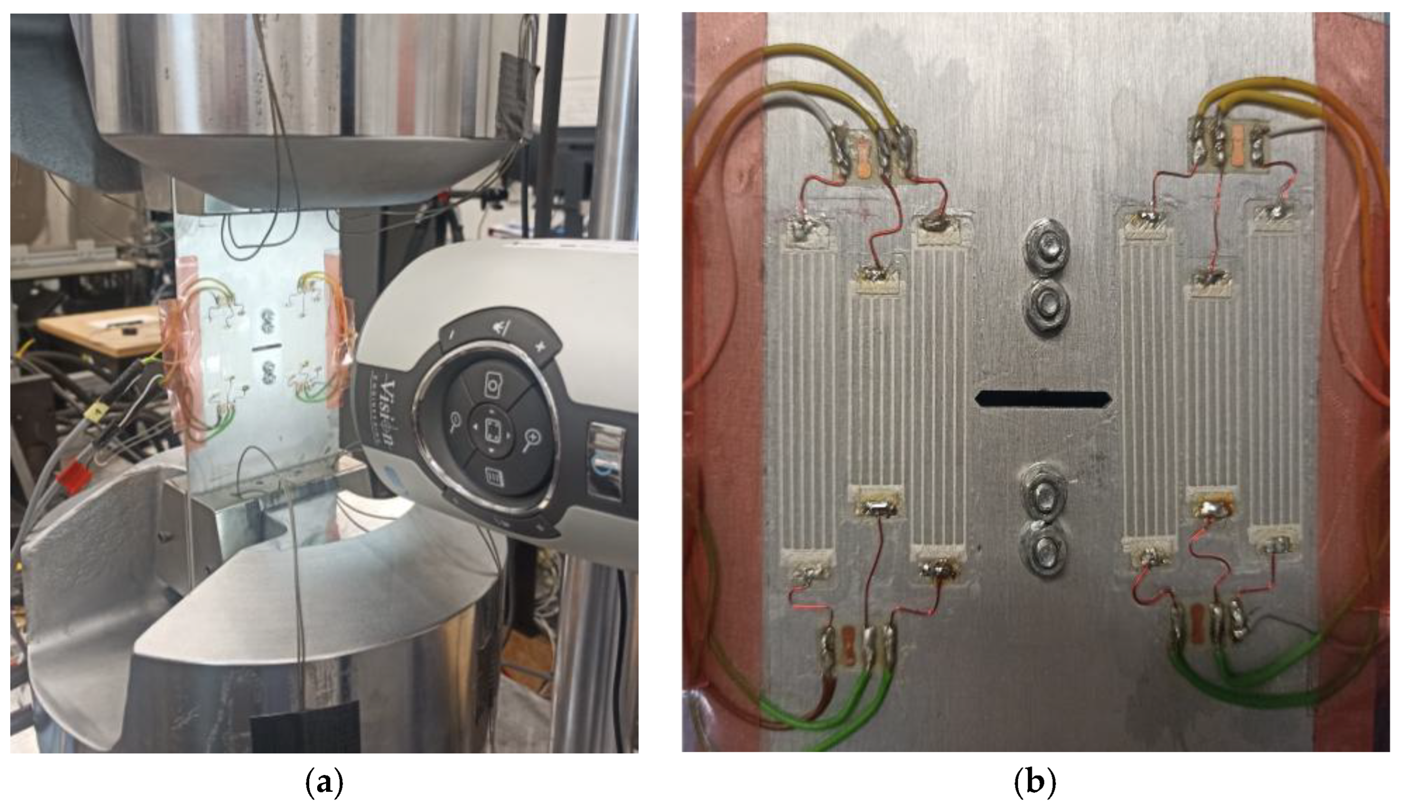 Figure 3b. The test rig induced the cyclic mechanical loading to the instrumented specimen, fixed in tester grips. The sinusoidal-type constant amplitude loading was used, with an amplitude of 11 kN and 0.5 cycle asymmetry ratio to develop fatigue crack in the specimen. The area where the crack propagation started was the central part of the sample, from the created notch, almost equally in both directions.