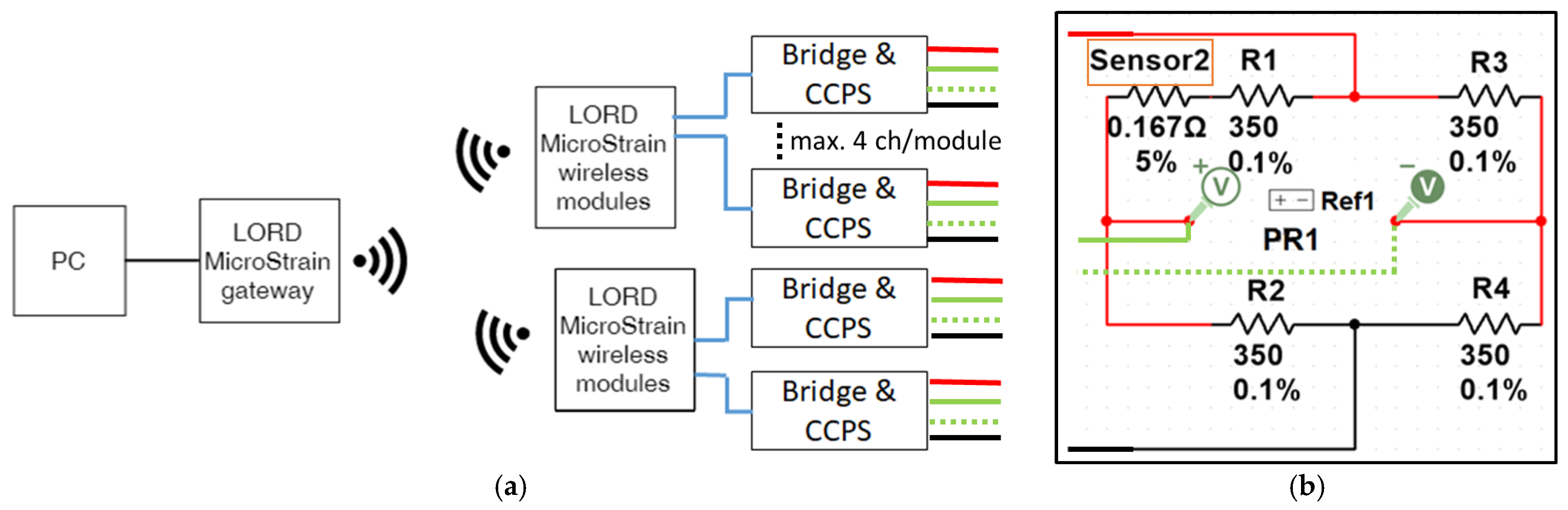 Figure 4. Data acquisition system is composed of two V-Link 200 multichannel sensors modules (MicroStrain, Williston, VT, USA). A single V-Link-200 module provides four analog channels, compatible with a Wheatstone bridge measurement circuits using 120, 350, and 1 kΩ resistors with fixed 4.096 V bridge excitation. For each measuring channel, the sensor was fitted in series in one arm of a Wheatstone Bridge composed of 350 Ω precise resistors R1 ÷ R4 (Elpod, Cracow, Poland) (