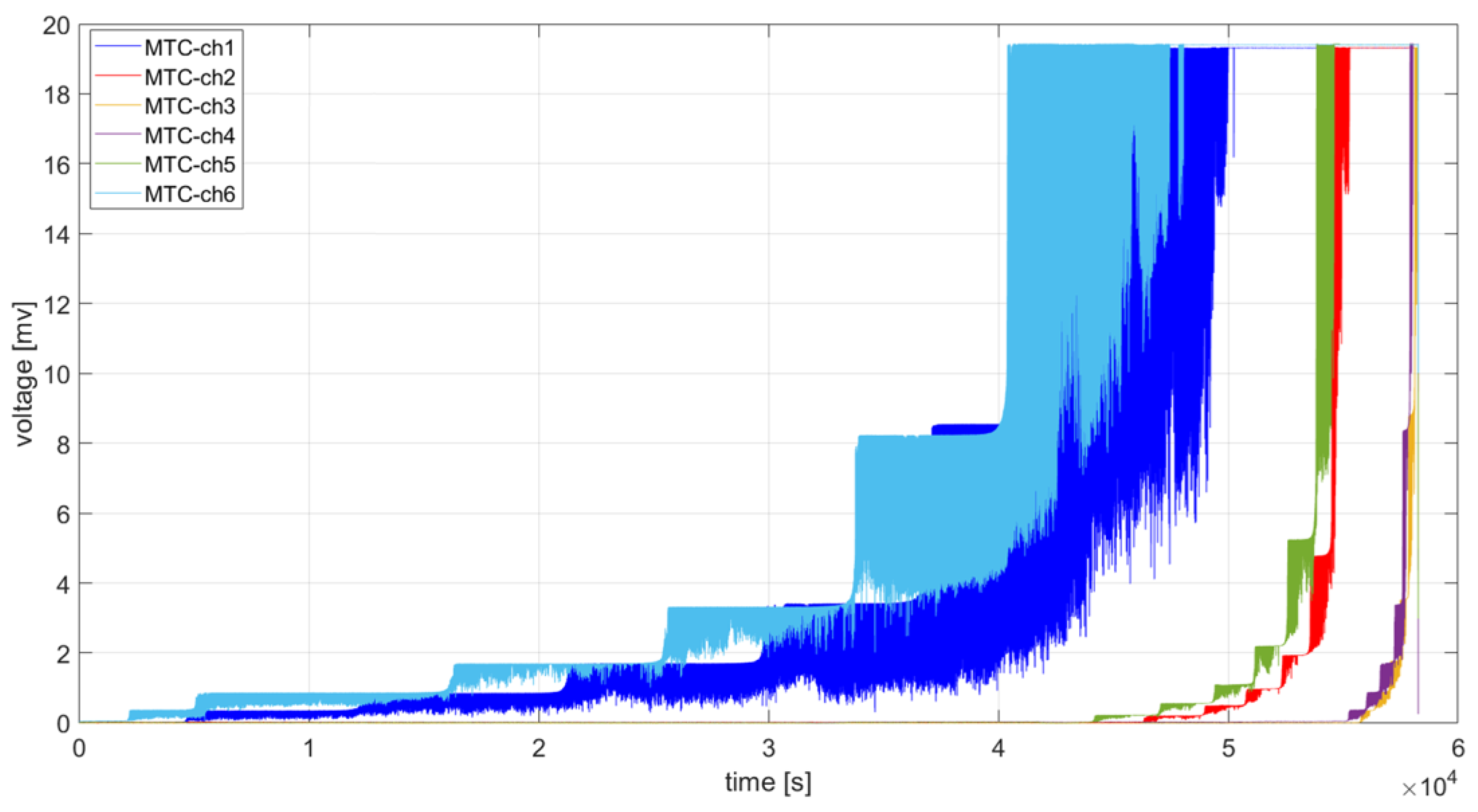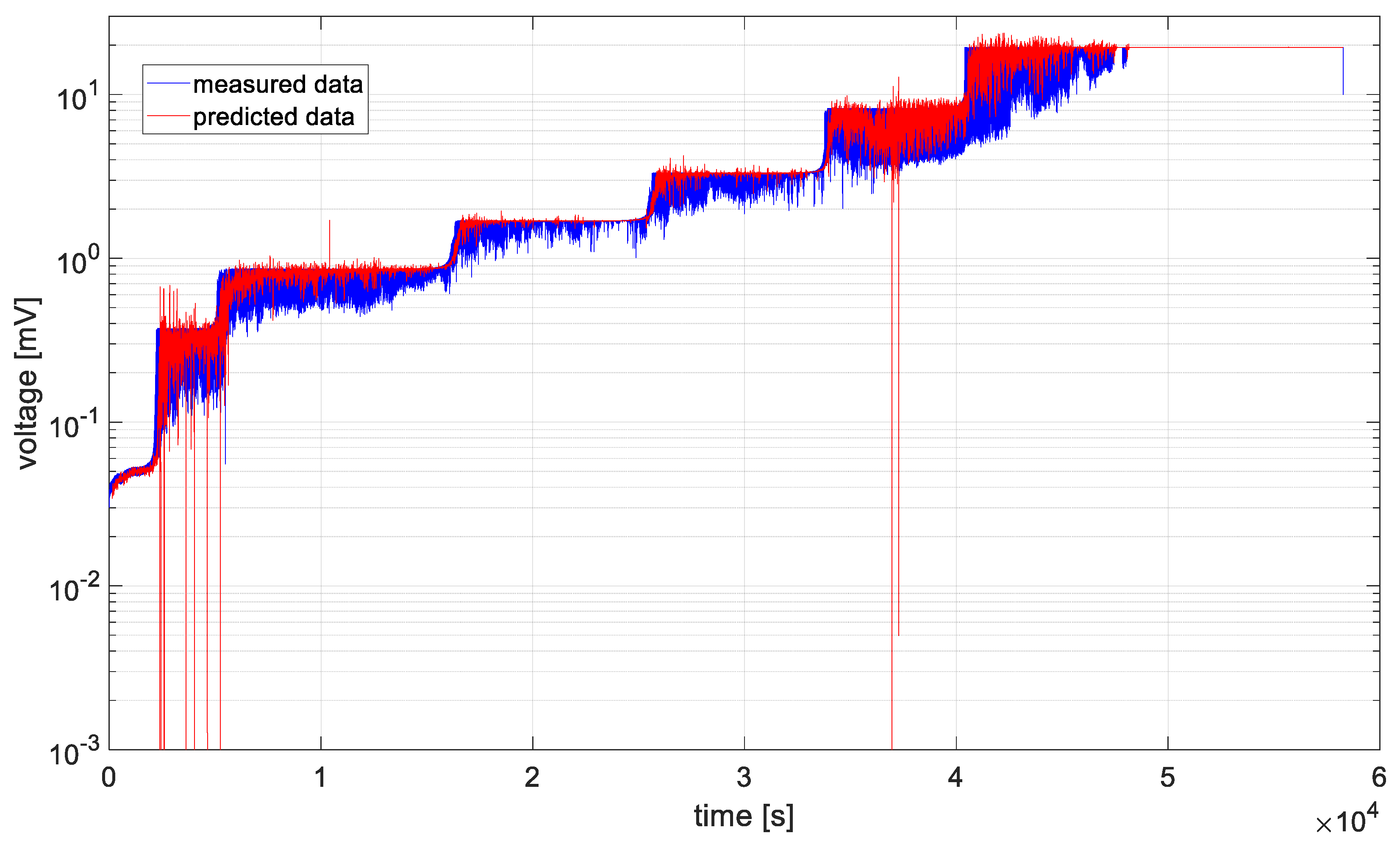 Figure 5, it is possible to distinguish a component with a constant level and a rising trend. The constant level of the variable is characterized by local maximum voltage level with oscillations caused by mechanical cycling of the specimen. The trend, on the other hand, is characterized by a tendency for the values of the components of the time series data to change in an ascending manner due to sensor grid element breakage. During the detailed analysis of the data, it will be necessary to determine the time intervals for which the constant component and the trend can be distinguished. At a further stage, appropriate time series models will be adopted and tests will be carried out on their compatibility with the estimated data.