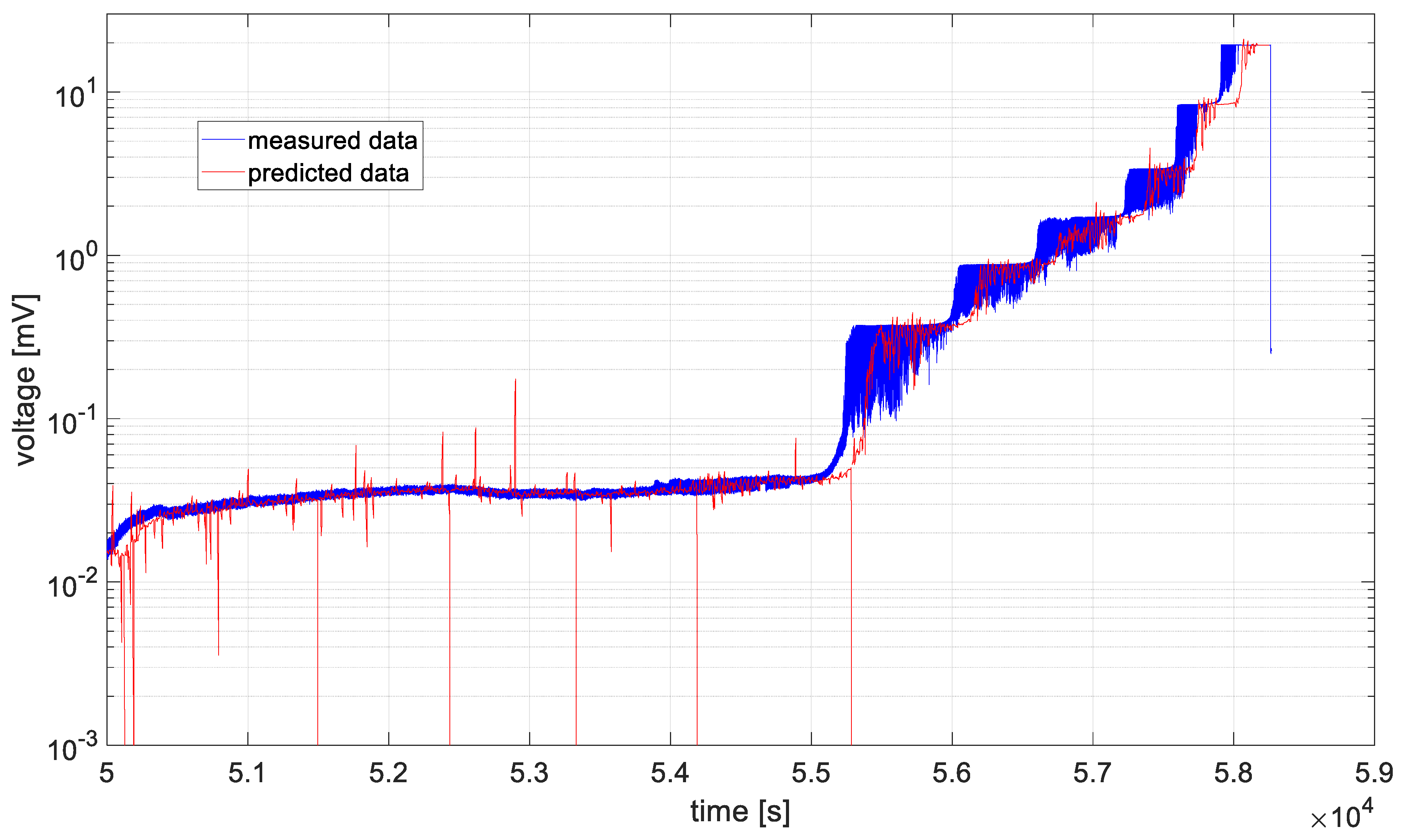 Figure 11, the largest overestimations of the series values occur. In this case, preliminary data processing could be attempted before proceeding with the prediction process. Moreover, the best fit between the predicted and measured data during the onset of the cracking process occurs in cases 2 and 3, where the smallest data fluctuations (resulting in significant data smoothing) were observed.