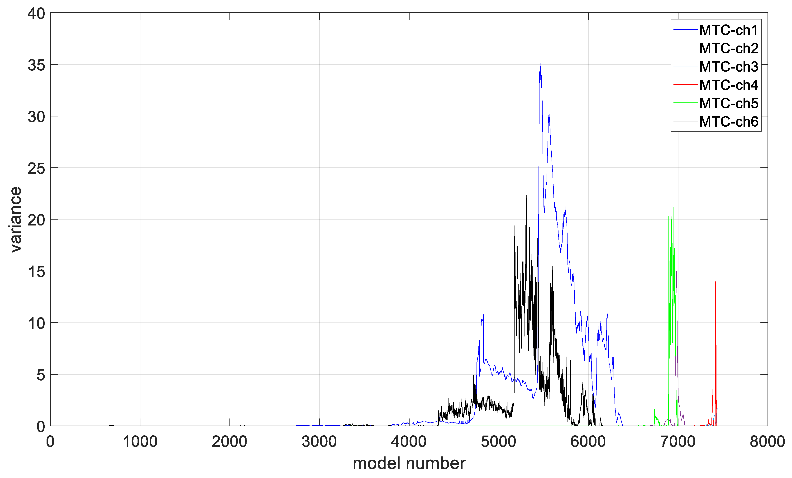 Figure 12. Based on the illustrated figure, it can be stated that the variance level is channel-dependent and is in the range of 20 ÷ 35 for measurements form sensors closer to the middle notch of the specimen (ch1 and ch6). For the rest of channels, the variance is in the range of 15 ÷ 20, with the lowest values observed for channel 3.