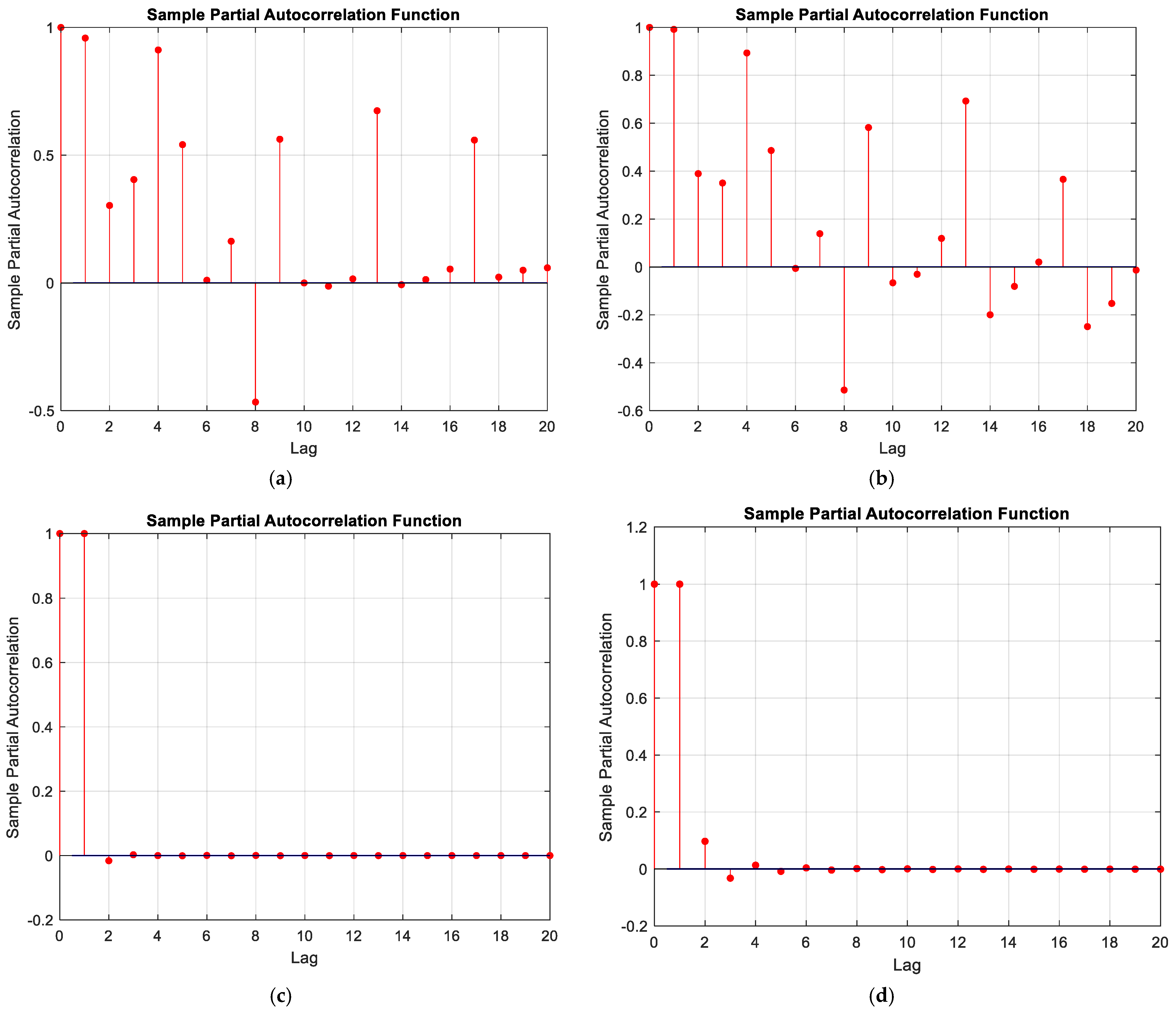 q = 1). The forecasted data consisted of 1000 consecutive samples, while the range of the base data was 20,000 samples. The ARIMA time series model can be applied to stationary datasets; therefore, the partial autocorrelation function (PACF) was examined for all measured data series. In all cases, a clear reduction in values was observed after a single integration of the time series.