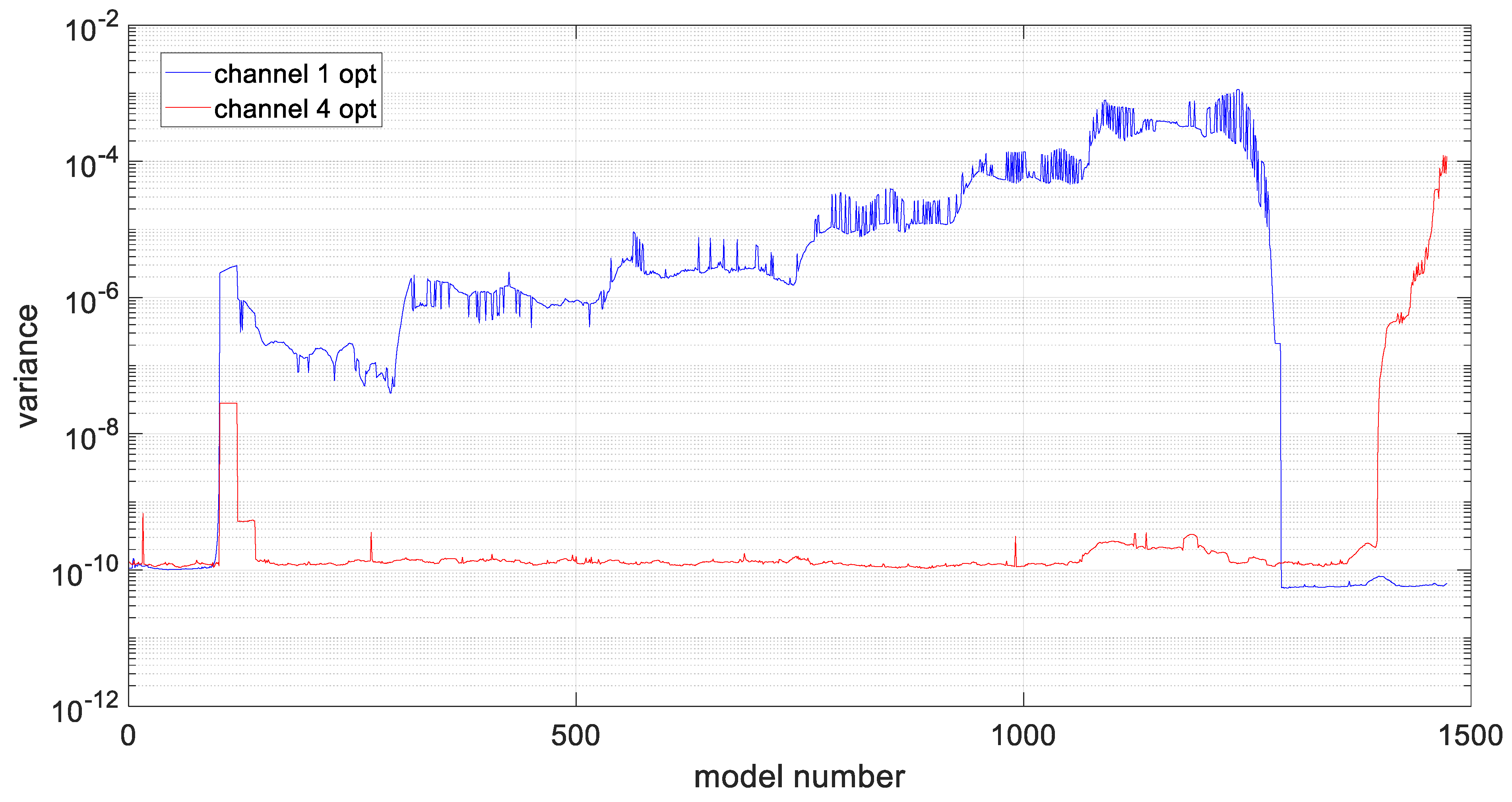 In order to assess the quality of model fitting, variance plots of the models were generated for individual channels, assuming ARIMA model parameters equal to one, as shown in