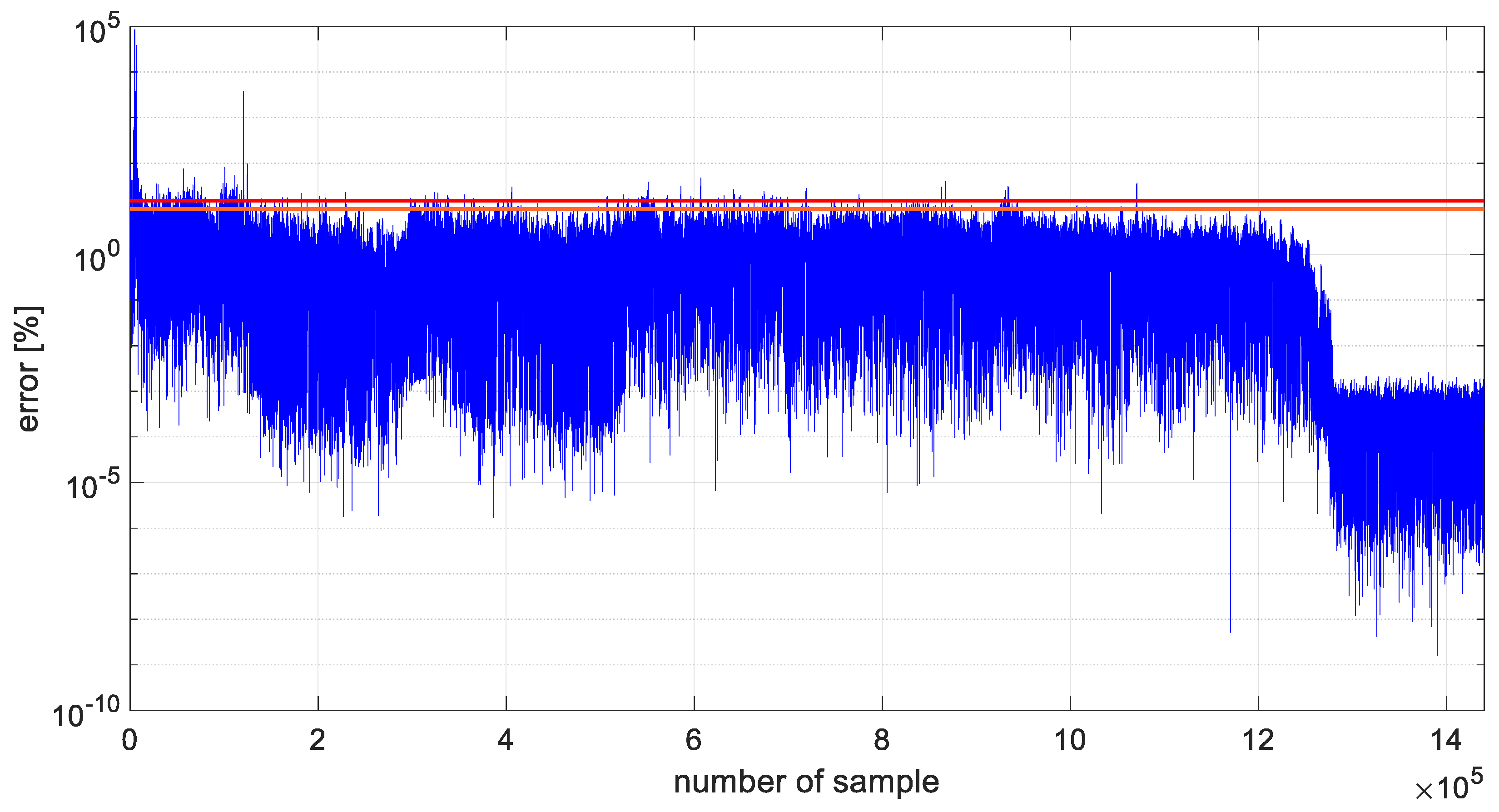 Figure 18. The 10% error threshold is indicated by an orange line, whereas the 15% threshold is marked in red. The plots demonstrate that the majority of the generated models estimate the sensor’s output voltage with an error below 10%. For channel 1, prediction errors greater than 10% occur in 2.3% of the data, and errors exceeding 15% occur in 1% of the forecasted samples. For channel 4, these percentages are 6.4% and 4.1%, respectively.