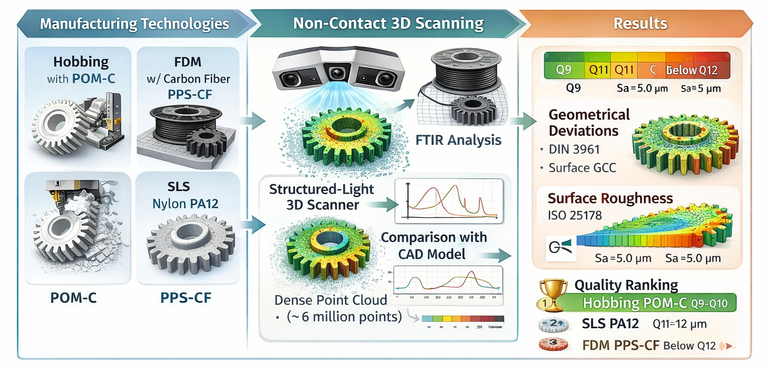 - Integrating high-resolution optical scanning with advanced data processing provides a framework for evaluating geometrical deviations in polymer gears. Using a GOM Scan 1 3D scanner with blue structured light, the methodology captured dense point clouds (exceeding 6 million points), ensuring fine surface details and roughness were resolved.