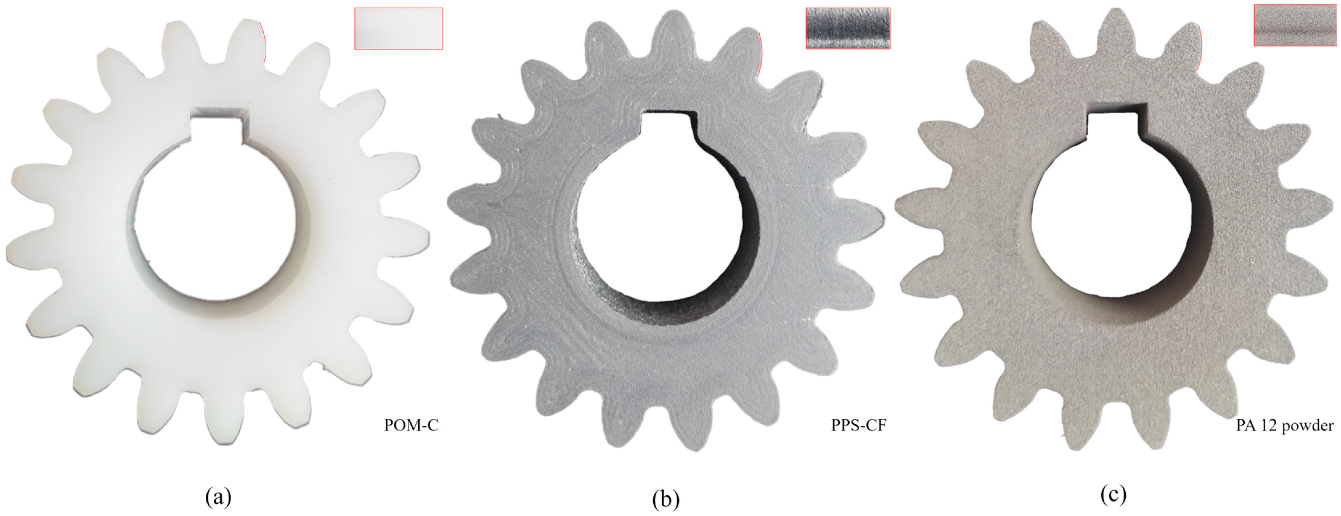 - Liu, J.; Feng, K.; Su, Z.; Ren, B.; Liu, Y. Dimensional Deviations and Distortion Mechanism of Polymer Spur Gear Fabricated by Fused Deposition Modeling. J. Mater. Eng. Perform. 2024, 34, 3026–3035. [Google Scholar] [CrossRef]