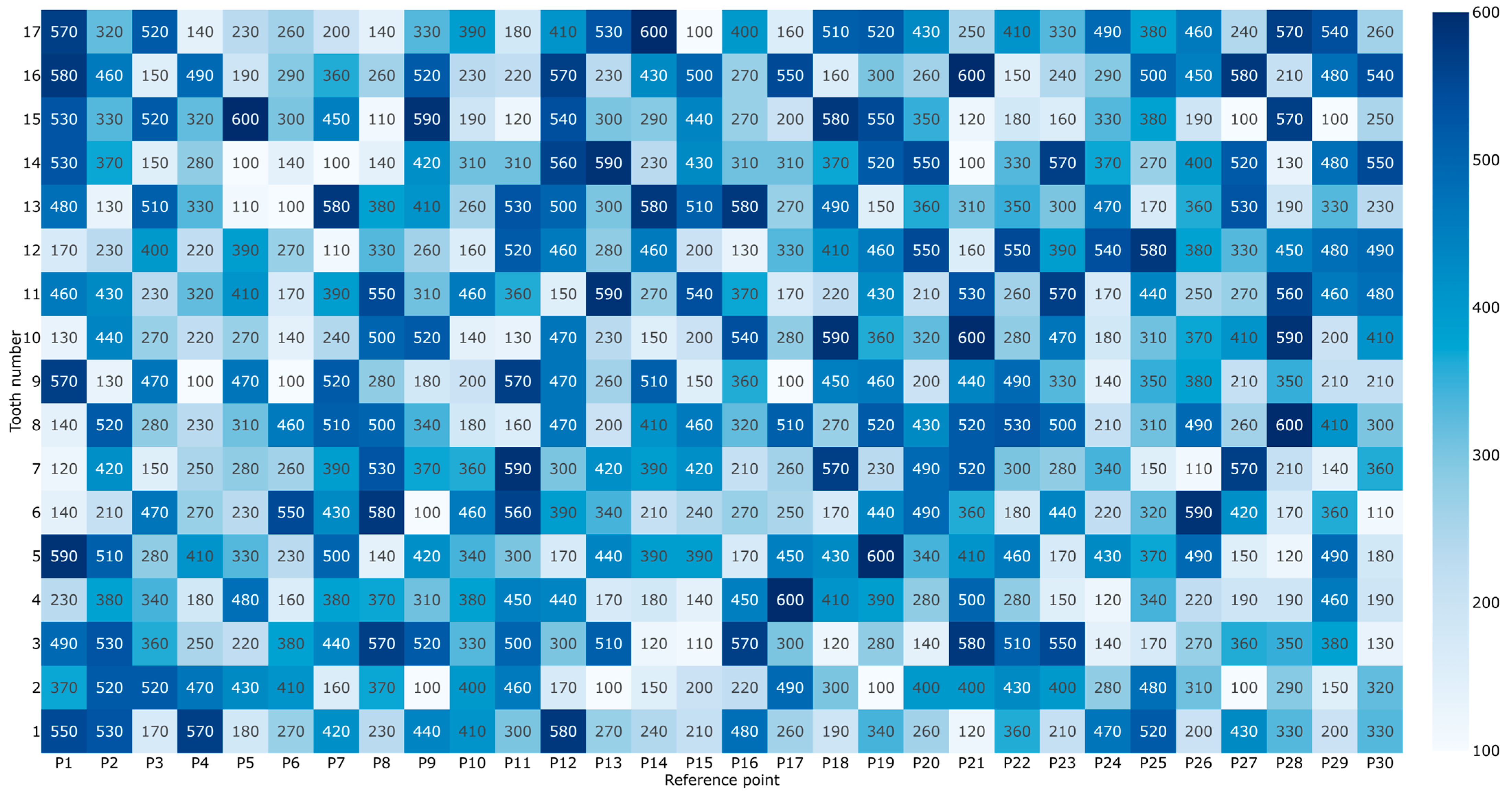 | P16 | 480 | 220 | 570 | 450 | 170 | 270 | 210 | 320 | 360 | 540 | 370 | 130 | 580 | 310 | 270 | 270 | 400 |