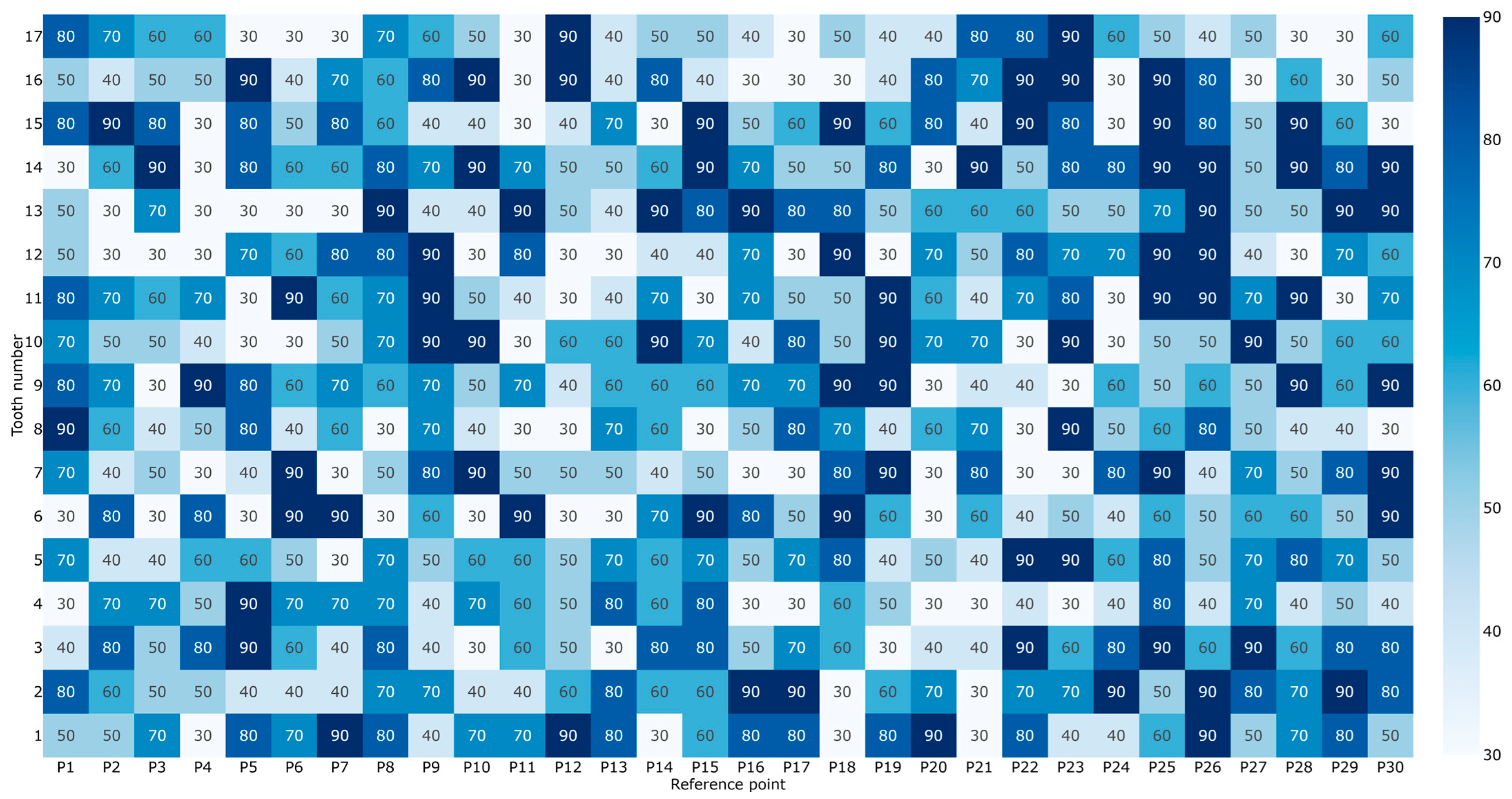 | P30 | 60 | 50 | 50 | 50 | 50 | 60 | 40 | 40 | 50 | 60 | 40 | 50 | 50 | 60 | 50 | 60 | 50 |