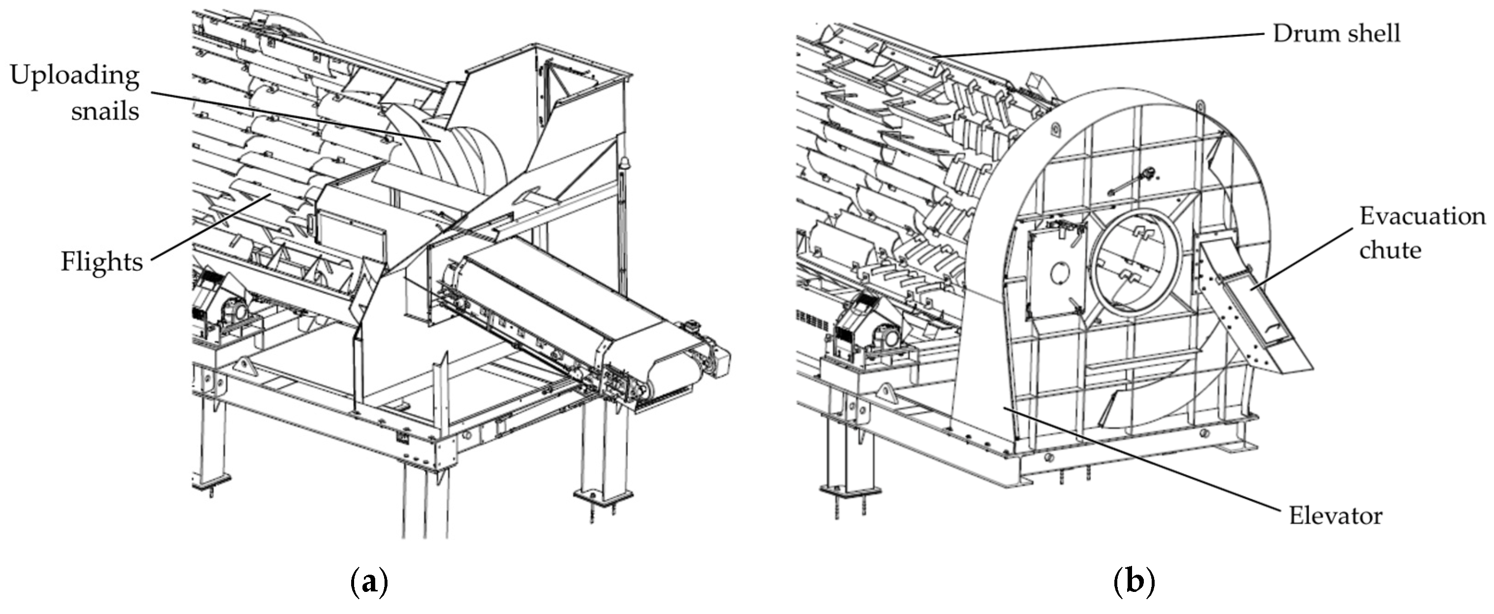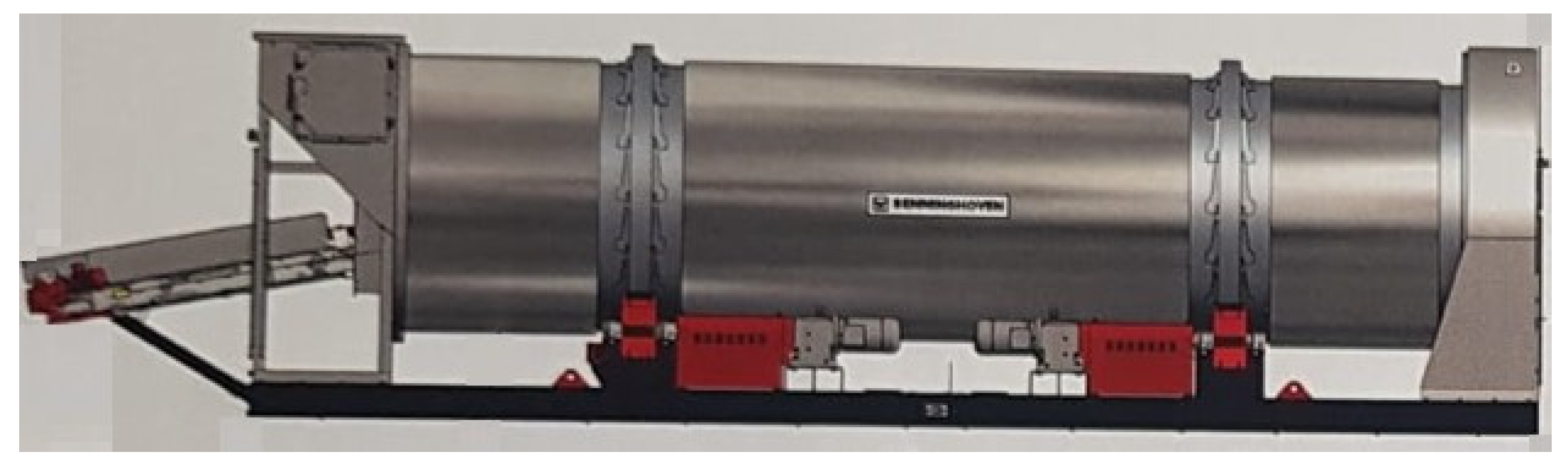The industry of asphalt plays an important role and has an impact on the global economy, environmental protection, and people’s everyday life, especially due to population growth, rapid urbanization, and the necessity to improve and extend the global transportation infrastructure (motorways, highways, roads) in order to support economic activities and sustain connectivity. The total length of paved highways and roads exceeds 14 million km and continues to grow. In 2007, according to European Asphalt Pavement Association (EAPA), 5.2 million km were paved in Europe, 4.0 million km in the United States, 1.5 million km in China, 2.5 million km in the rest of Asia, 415,000 km in Canada, 344,000 km in Central and South America, 178,000 km in Mexico and, 64,000 km in Australia and New Zealand [1]. According to the market research reports, the global asphalt market is projected to reach 225.9 million tons by 2030, up from 158.5 million tons in 2024 [2], and is expected to increase from 563.3 million USD in 2025 to 676 million USD in 2030 [3]. In order to meet the growing market demands, as well as the legislative requirements and the quality standards, the companies continuously invest in research to improve, develop, and use different materials, technologies, and equipment in asphalt mixing plants. The asphalt mixing plants are the key components in the asphalt production process because they receive mineral aggregates (such as sand, crushed stone, gravel, recycled materials) and transform them into the final asphalt product by drying, heating, and mixing with the asphalt binder. The quality and characteristics of aggregates are essential to ensure high-quality asphalt pavement with strength and durability. In order to avoid premature pavement failure, it is very important to remove any moisture from the aggregates, as it can reduce adhesion to the asphalt binder and lead to the formation of weak spots [4]. Based on this, one of the most important components used in the asphalt production line is the direct rotary dryer that is responsible for removing moisture from the aggregates and heating them to temperatures typically between 135 and 200 degrees Celsius before the mixing process with the binder [4,5]. The rotary dryer is a steel cylindrical drum that rotates at different speeds and is slightly horizontally inclined (0–5 degrees) to ensure the longitudinal movement of the particles during the process (Figure 1). The drum’s interior features replaceable longitudinal blades of different sizes and shapes distributed around the entire circumference and along the full length of the cylinder, called flights, which lift, disperse, and drop the aggregates through the hot gas stream produced by a burner [6].