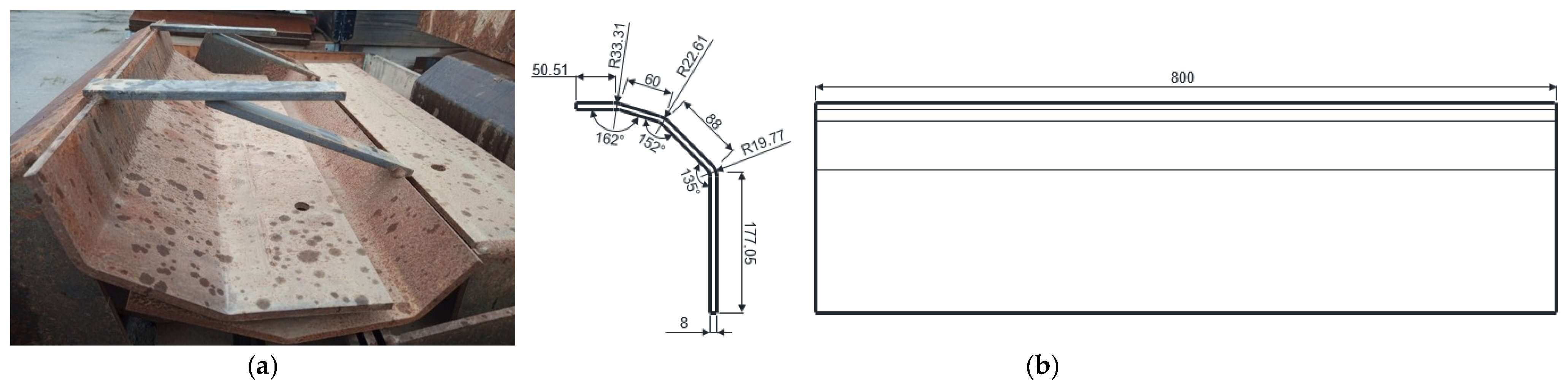 The flights used in the experimental research are the original flights (Figure 4) usually used in the rotary dryer in the drying-dispersion zone, manufactured by rolling, with a thickness of 8 mm, made of steel grade S235JR [21], with the chemical composition presented in Table 1.