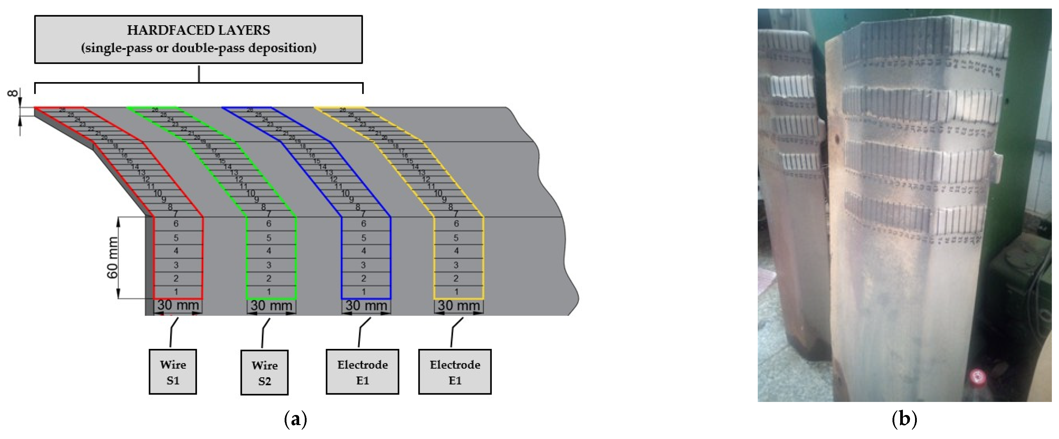 The rotary dryer flights were thoroughly cleaned prior to hardfacing by degreasing with an organic solvent (Safe Clean Eco, Tech Masters Trading SRL, Oradea, Romania), blowing with compressed air, rinsing with methyl-ethyl-ketone (MEK, CHIMREACTIVE SRL, Bucharest, Romania), and wiping with a solvent-resistant microfiber cloth. Four hardfaced layers were manually deposited on the surface of the rotary dryer flights, each layer corresponding to one of the four filler materials used, in either single-pass or double-pass deposition (Figure 5).