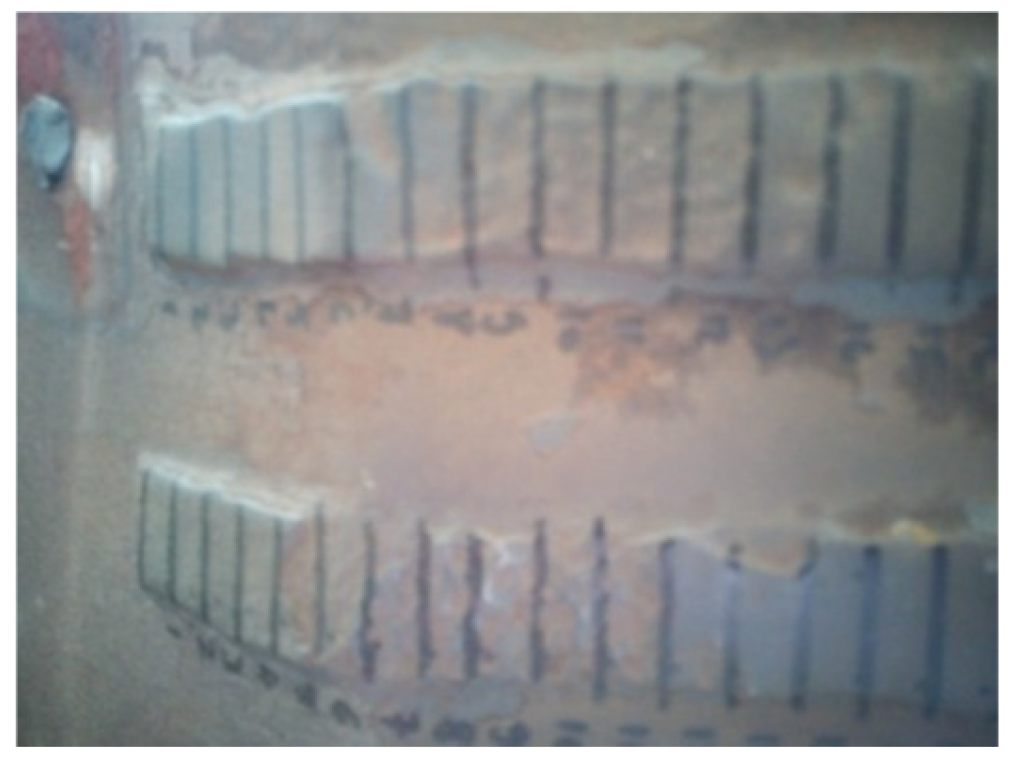 The hardfaced flights, prepared according to the above specifications, were mounted in the rotary drying drum and operated for 1150 h in the presence of mineral aggregates. During the operating time, there were two interruptions of the equipment necessary for thickness measurement, after 300 h and 730 h. Thus, the flights were removed from the rotary dryer, washed with methyl-ethyl-ketone (MEK), wiped with a solvent-resistant microfiber cloth, and dried with hot air. After the cleaning process, the marked grid was reapplied (Figure 8).