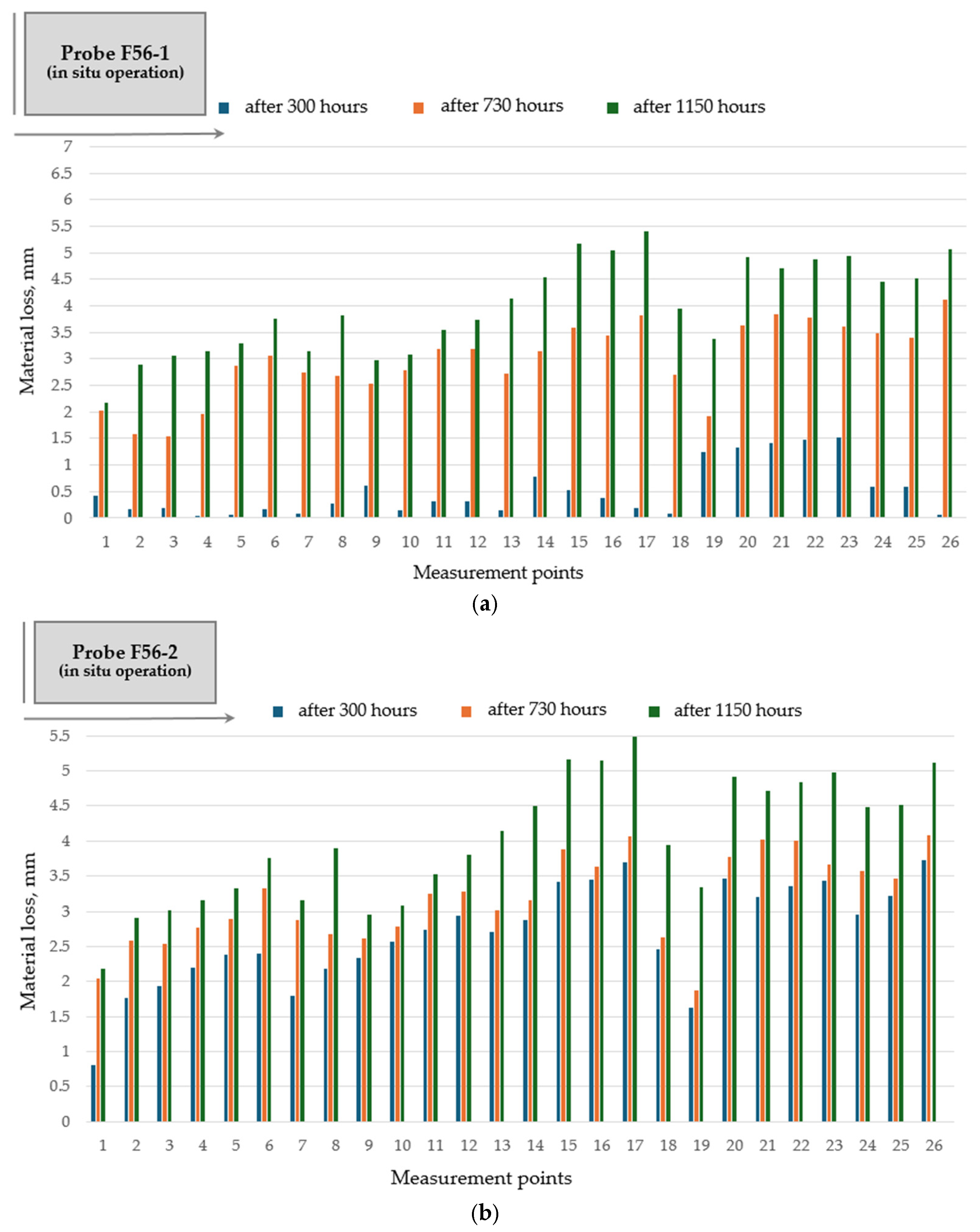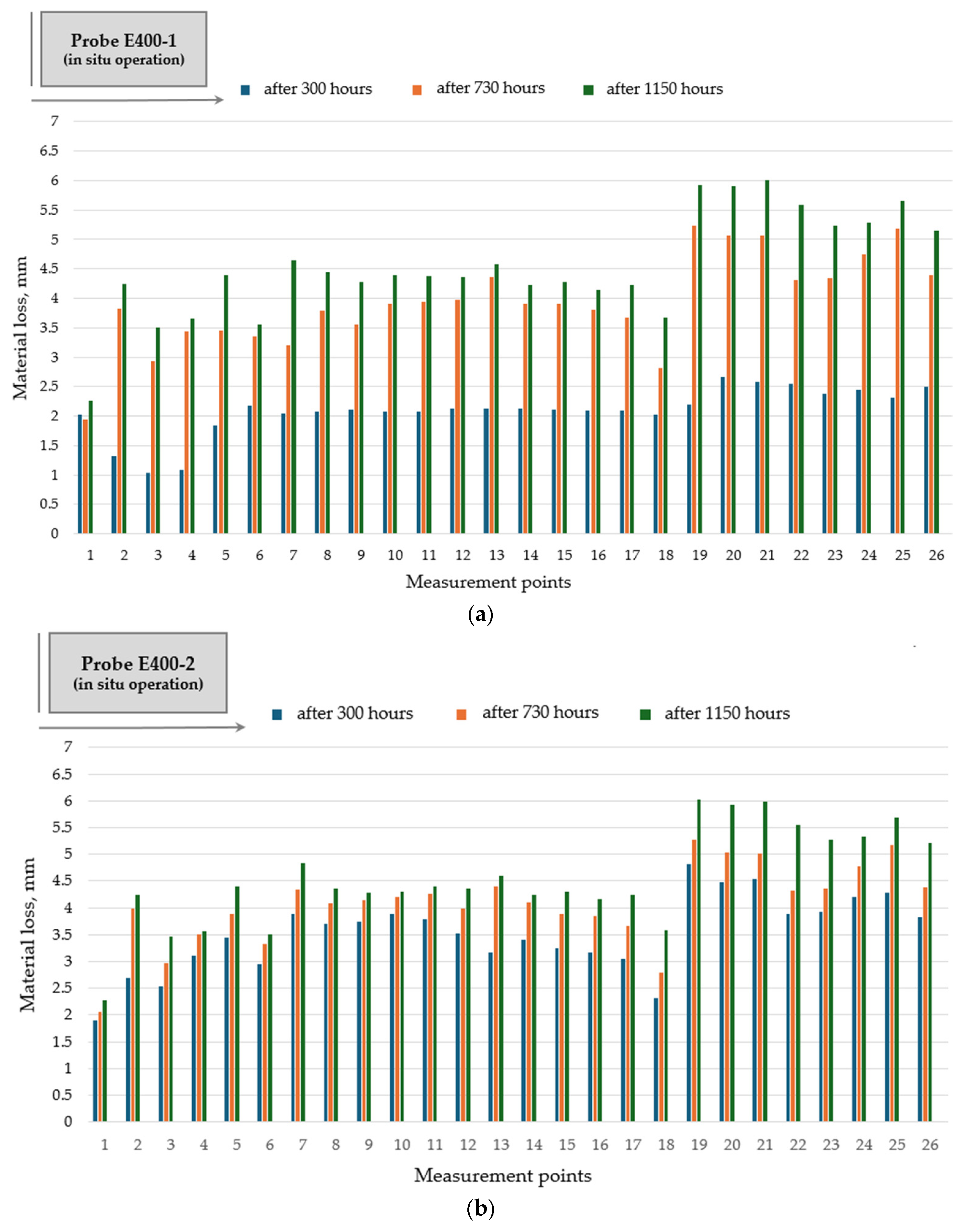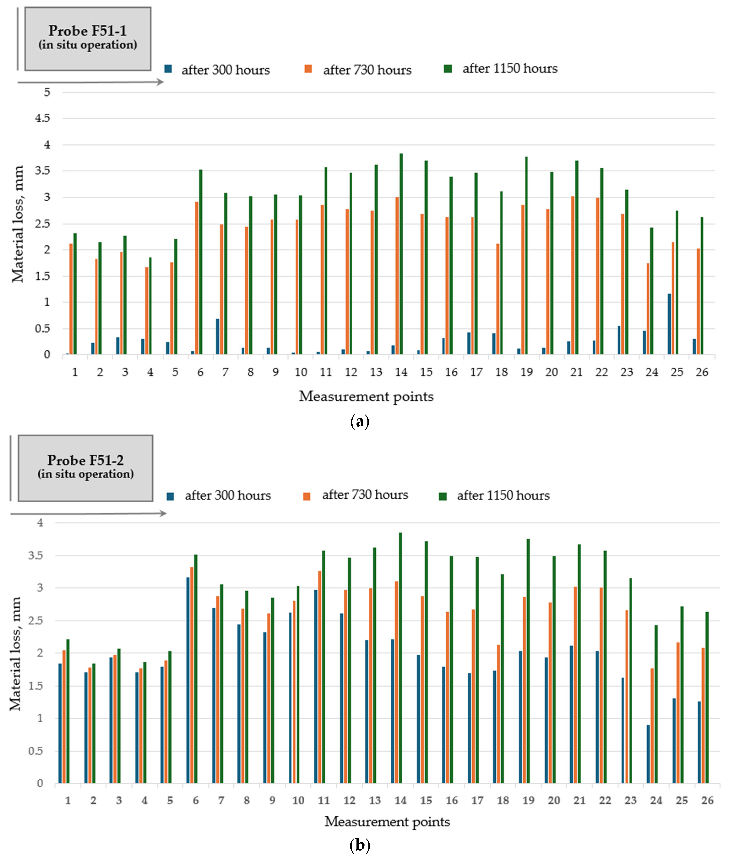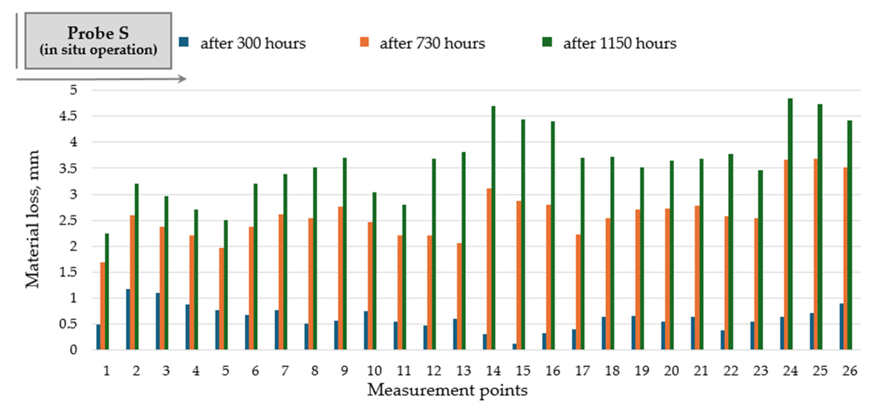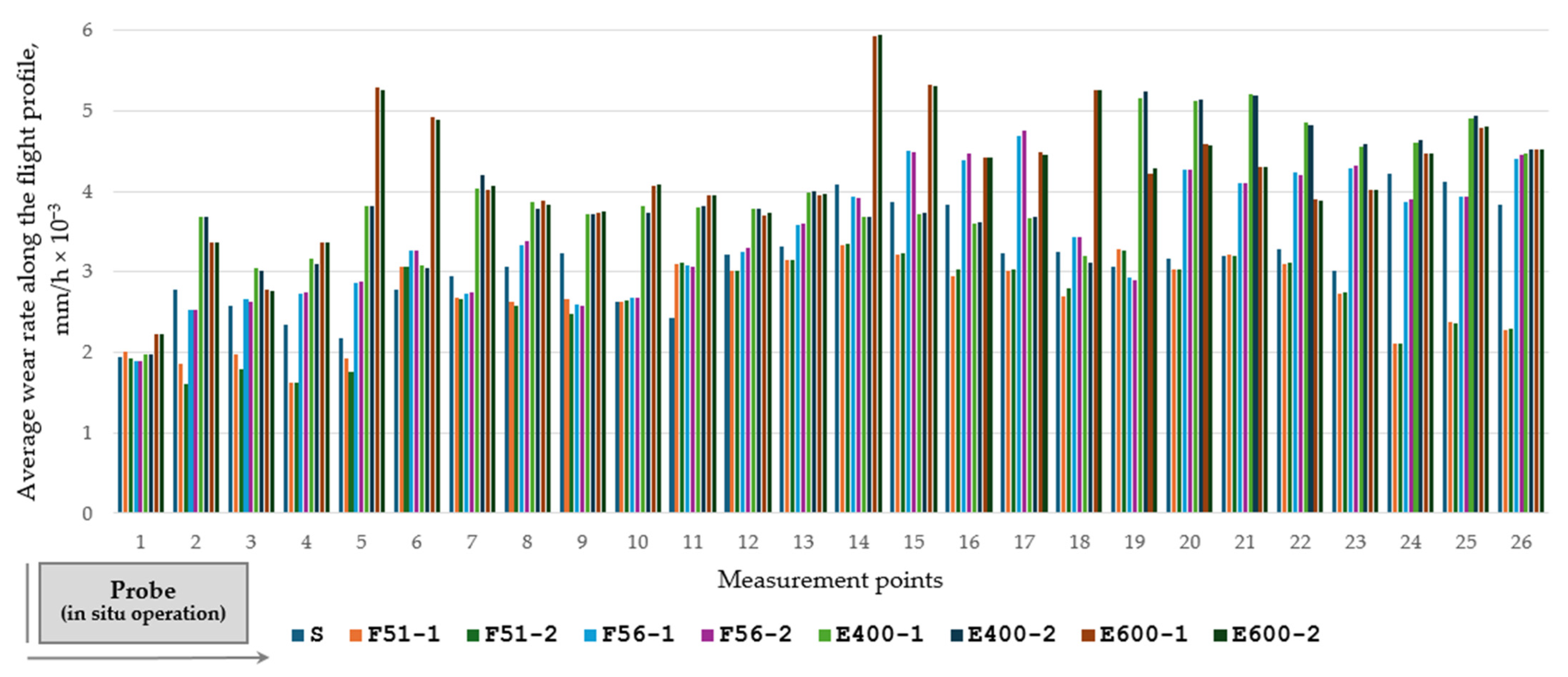Based on the experimental investigations and results, the average wear rate along the flight profile was expressed as material loss (thickness reduction) per hour of operation (Figure 14).