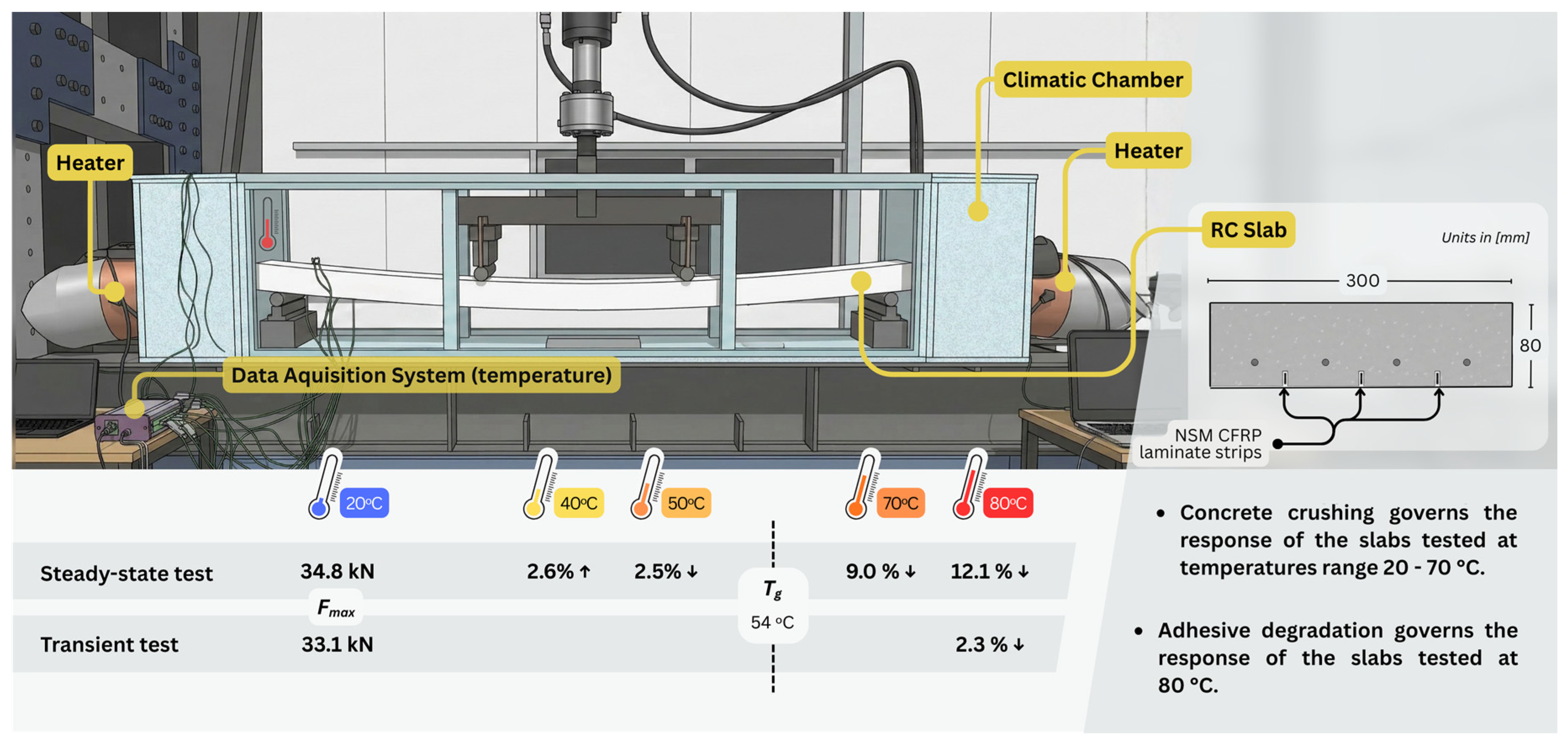 Silva, P.; Abdulrahman, H.H.; Escusa, G.; Correia, L.; Azenha, M.; Sena-Cruz, J. Experimental Assessment of the Effect of Temperature in the Range of 20–80 °C on Structural Behaviour of NSM CFRP Reinforced Concrete Slabs. Materials 2026, 19, 1382. https://doi.org/10.3390/ma19071382