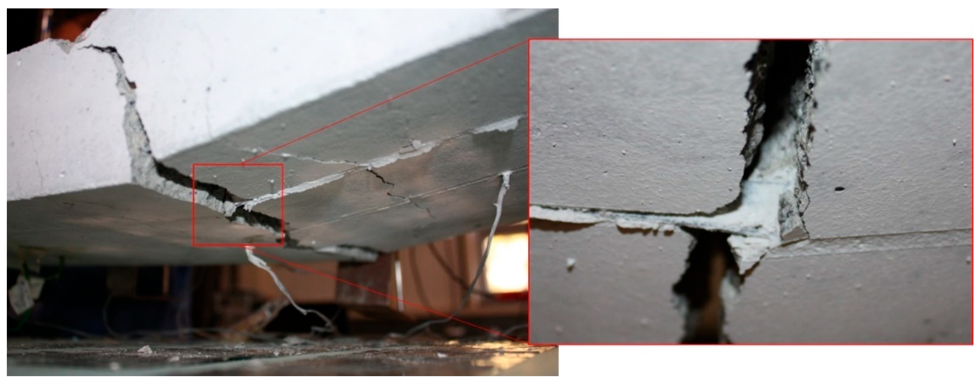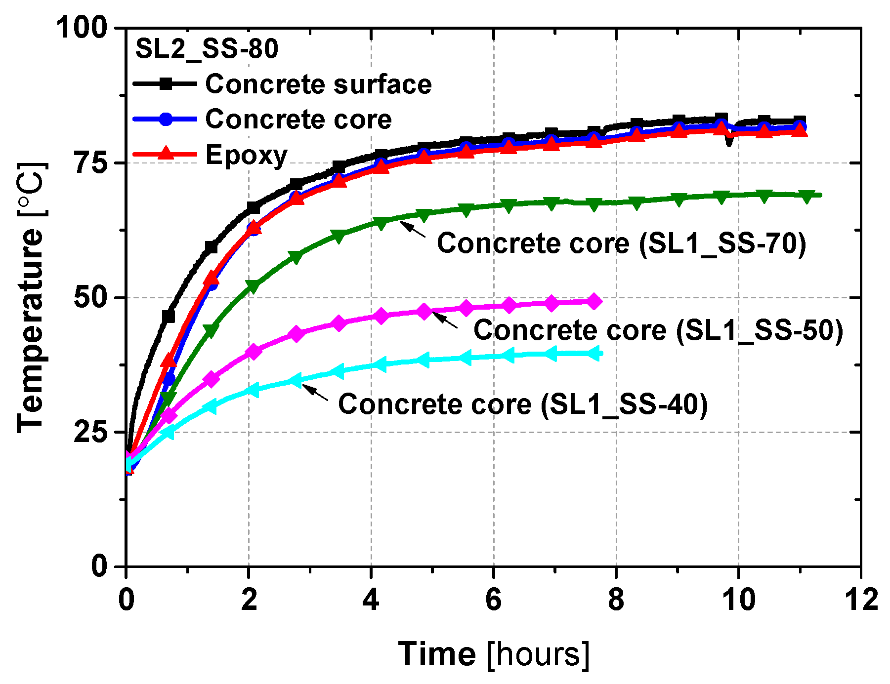 - At 80 °C, cohesive failure of the epoxy adhesive occurred, reducing the ultimate load capacity of the slabs by 11–13% in steady-state tests and by 1–3% in transient tests. These changes were associated with the degradation of the adhesive after exceeding the Tg, highlighting the susceptibility of bond performance to temperature.