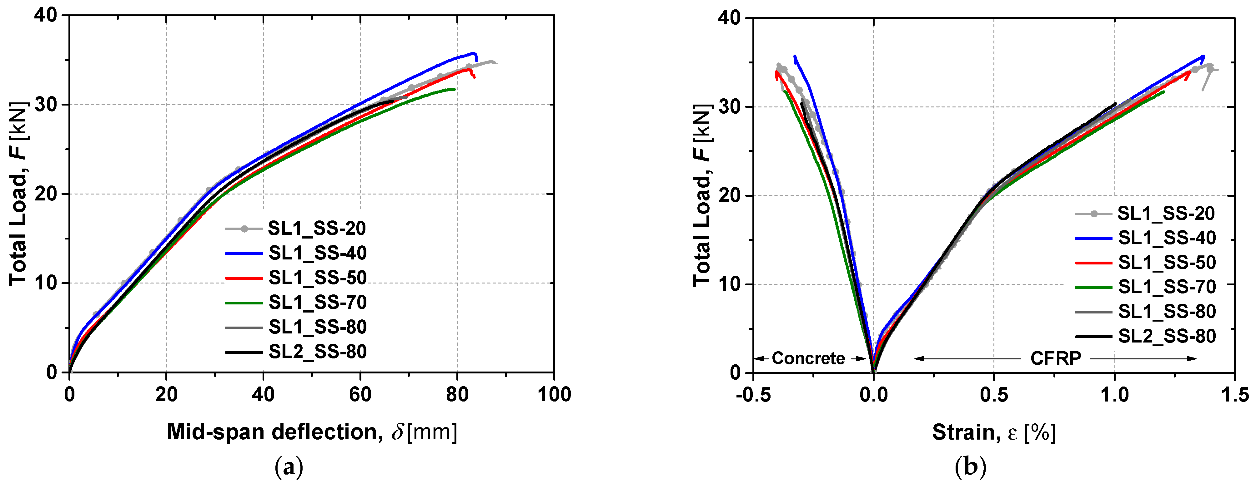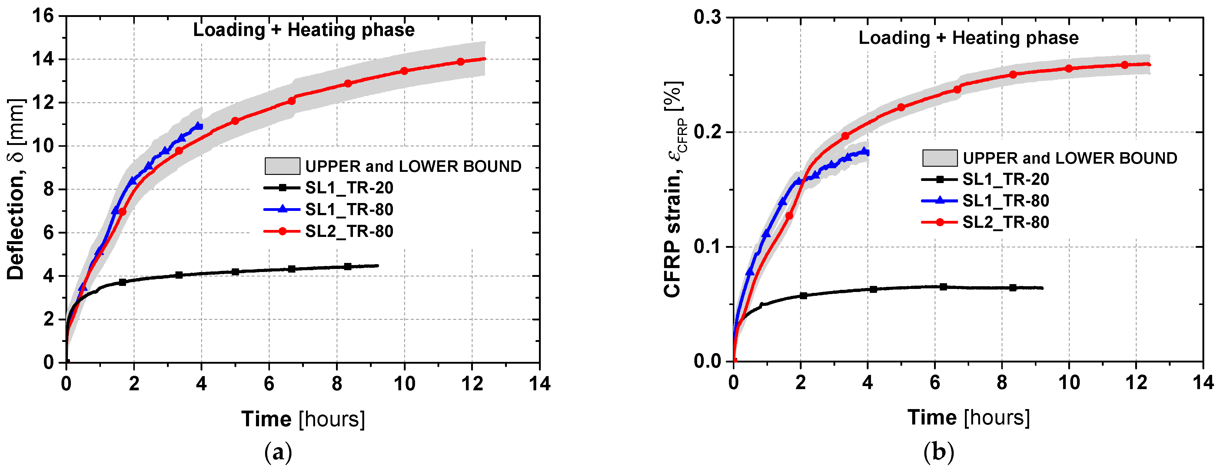 - In the TR tests, the CFRP laminates reached lower strains than in the SS tests, due to residual deflection after unloading and the effects of sustained load and heating.