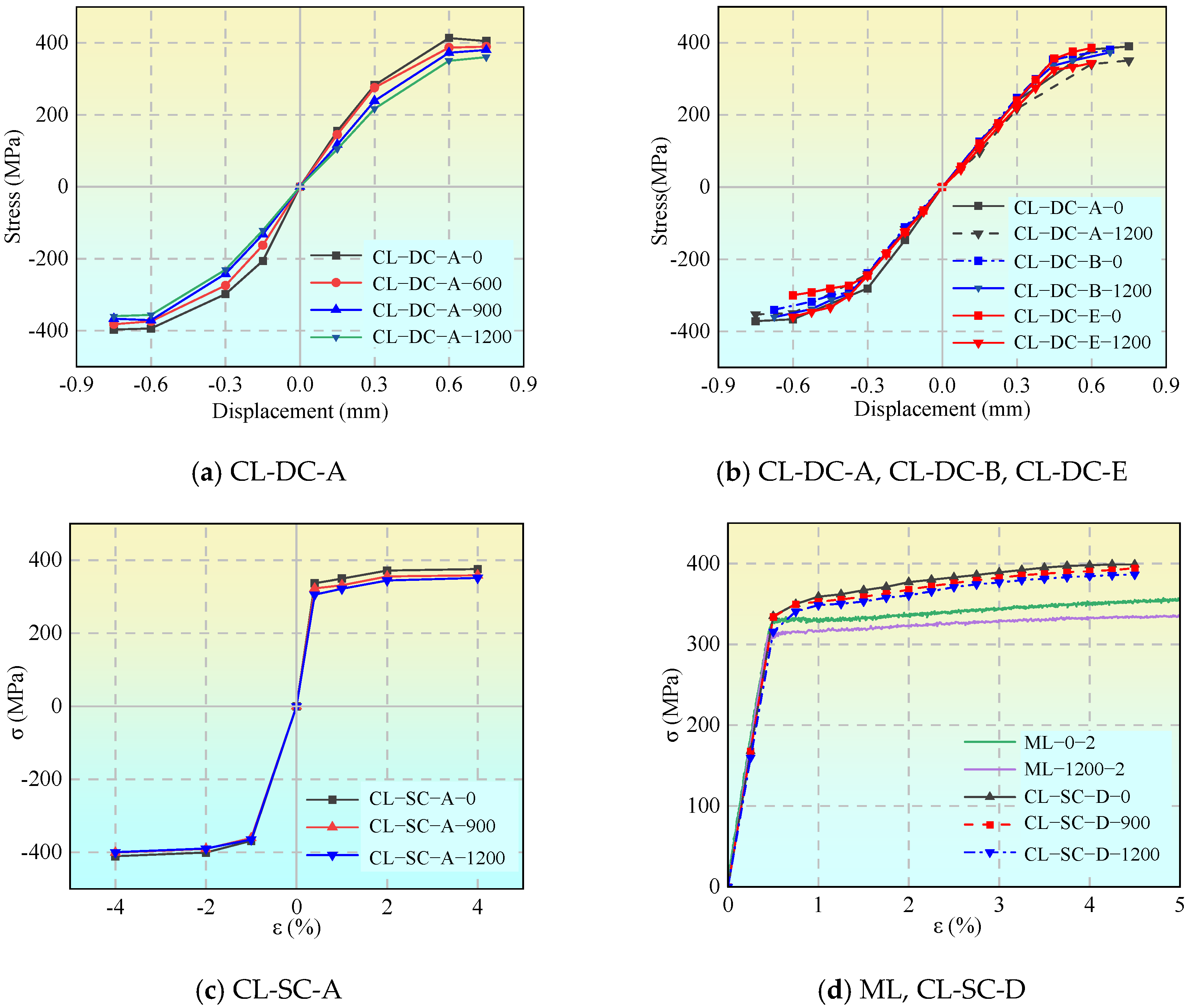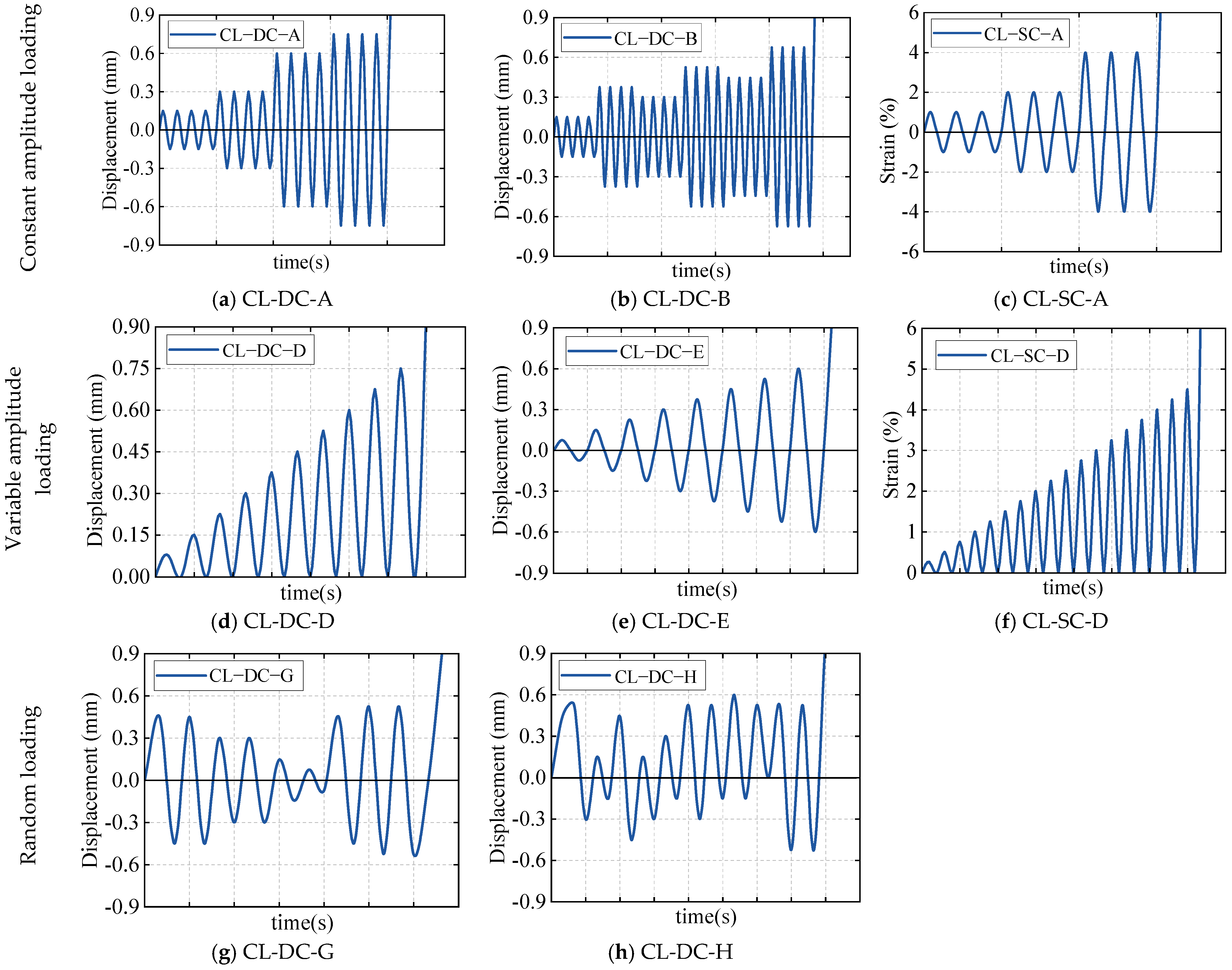| CL-DC-B | Constant-amplitude displacement: ±0.15 mm, ±0.375 mm, ±0.3 mm, ±0.525 mm, ±0.445 mm, ±0.675; each amplitude repeated 4 times. |