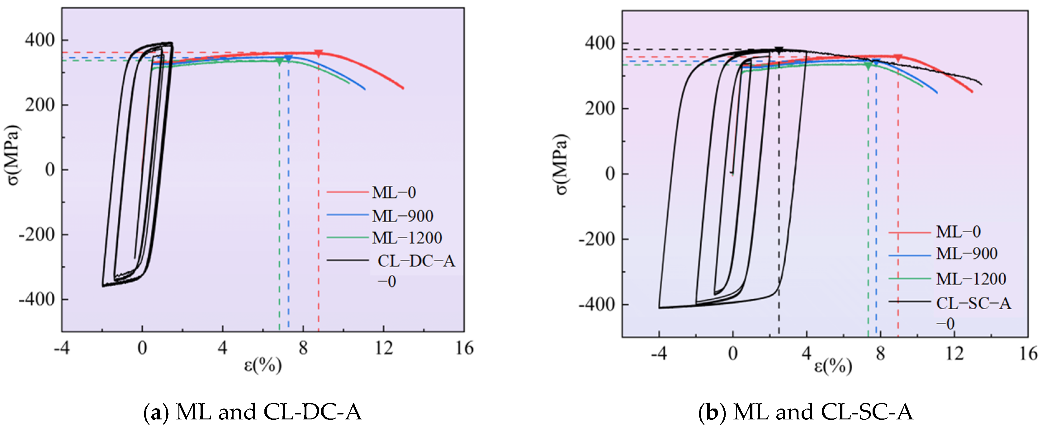 - Strain-controlled tests confirmed that the weakening of mechanical properties by corrosion persists throughout the entire process from elastic to fully plastic deformation. Within the large strain range, the material exhibits significant cyclic hardening, yet corrosion reduces its load-bearing capacity. At a strain amplitude of ±4%, the stable stress amplitude decreased from 376 MPa (uncorroded) to 350 MPa. However, corrosion did not significantly alter the plumpness of the hysteresis loops, suggesting the material still retains good energy dissipation potential.
