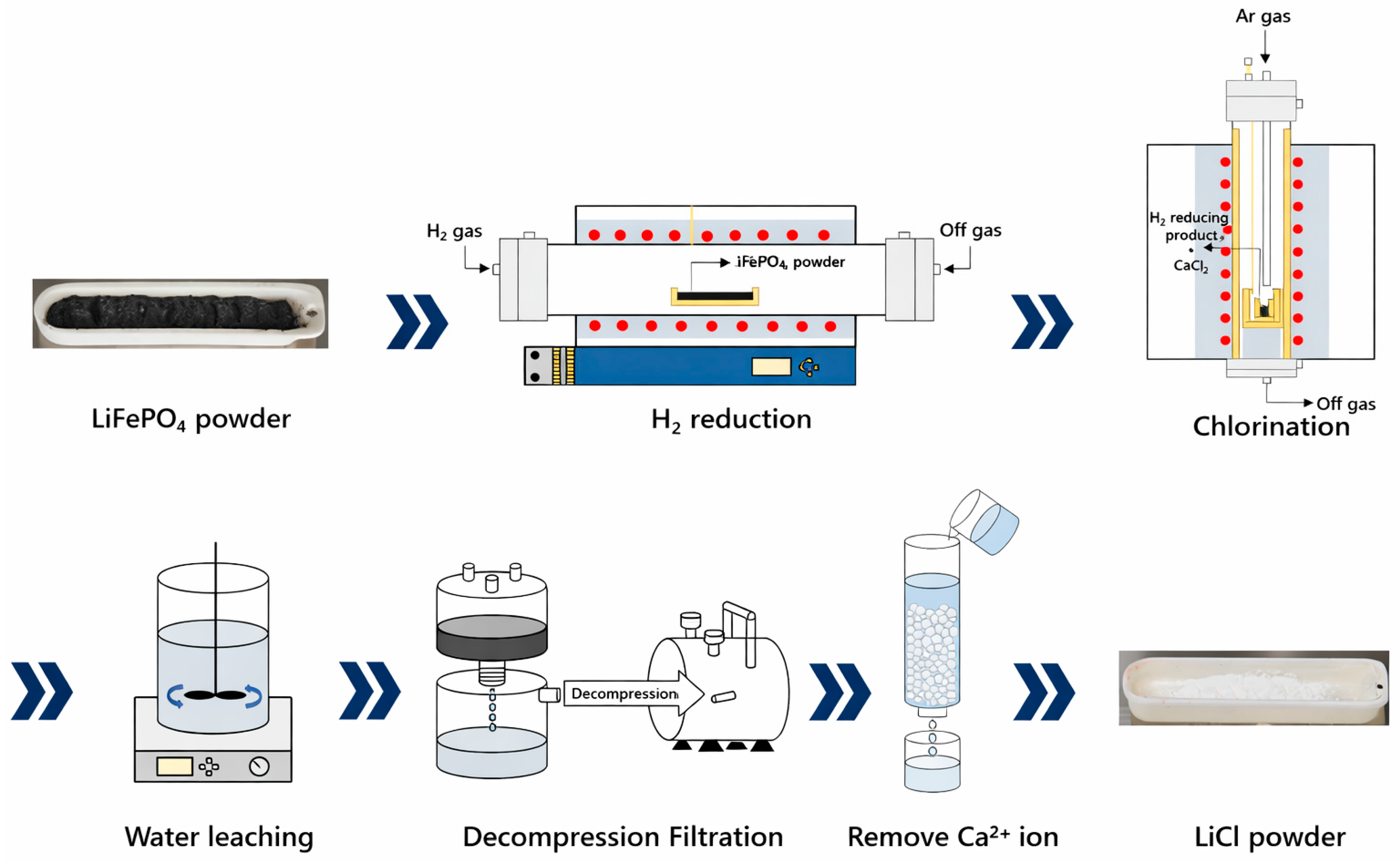 Overall process scheme for lithium recovery from LiFePO4 cathode powder via hydrogen reduction, CaCl2-assisted chlorination roasting, water leaching/vacuum filtration, and Ca2+ removal by ion exchange, including photographs of the starting LiFePO4 powder and the final recovered LiCl powder prepared in this study. Blue arrows indicate the process flow direction, and red circles denote the heating zone.